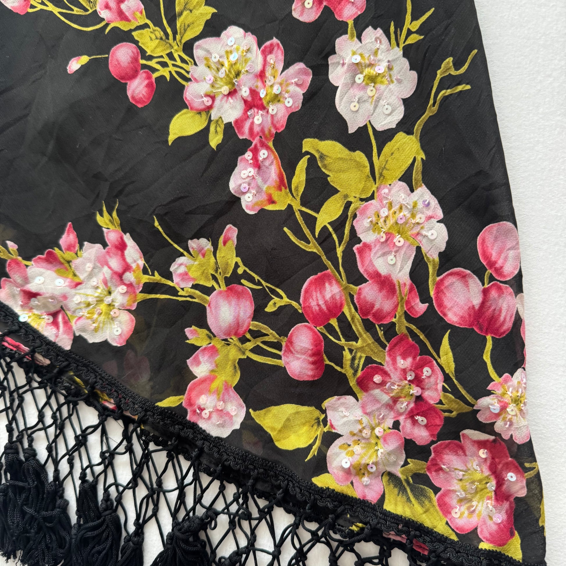 Beautiful black longsleeve with flowers and sequin details. Asymmetrical cut. See through material on the sleeves. Size S, Length: around 75cm