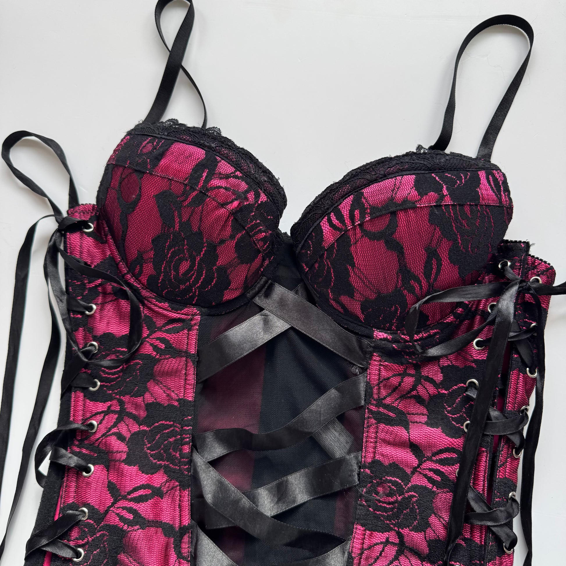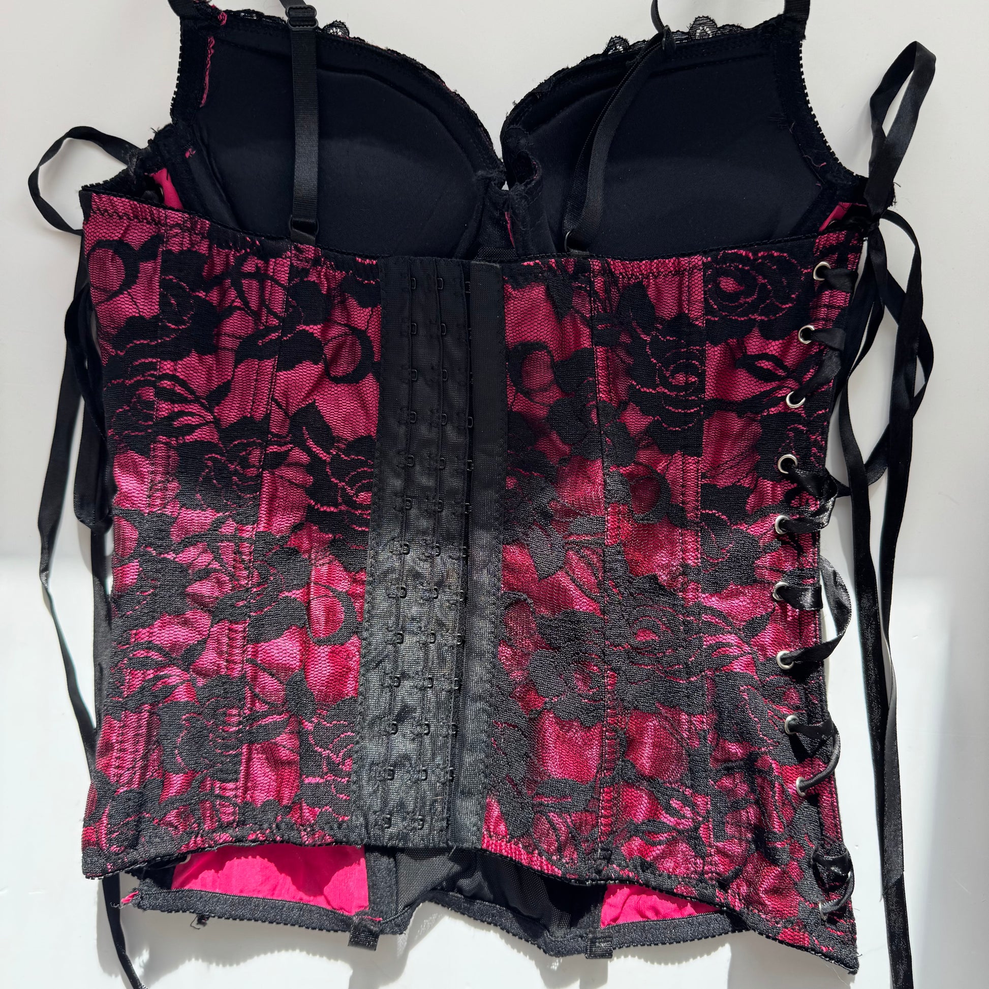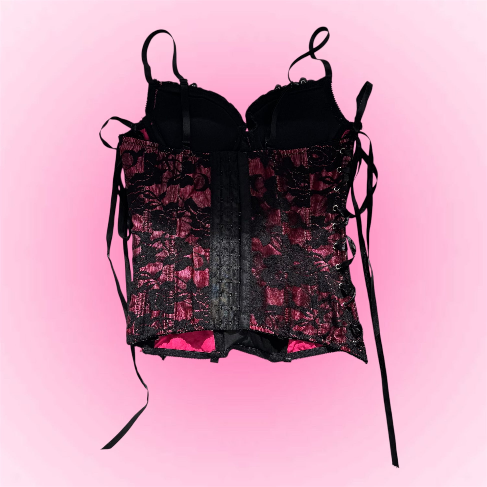 Beautiful pink corset with black lace up details on the sides and hooks in the back.