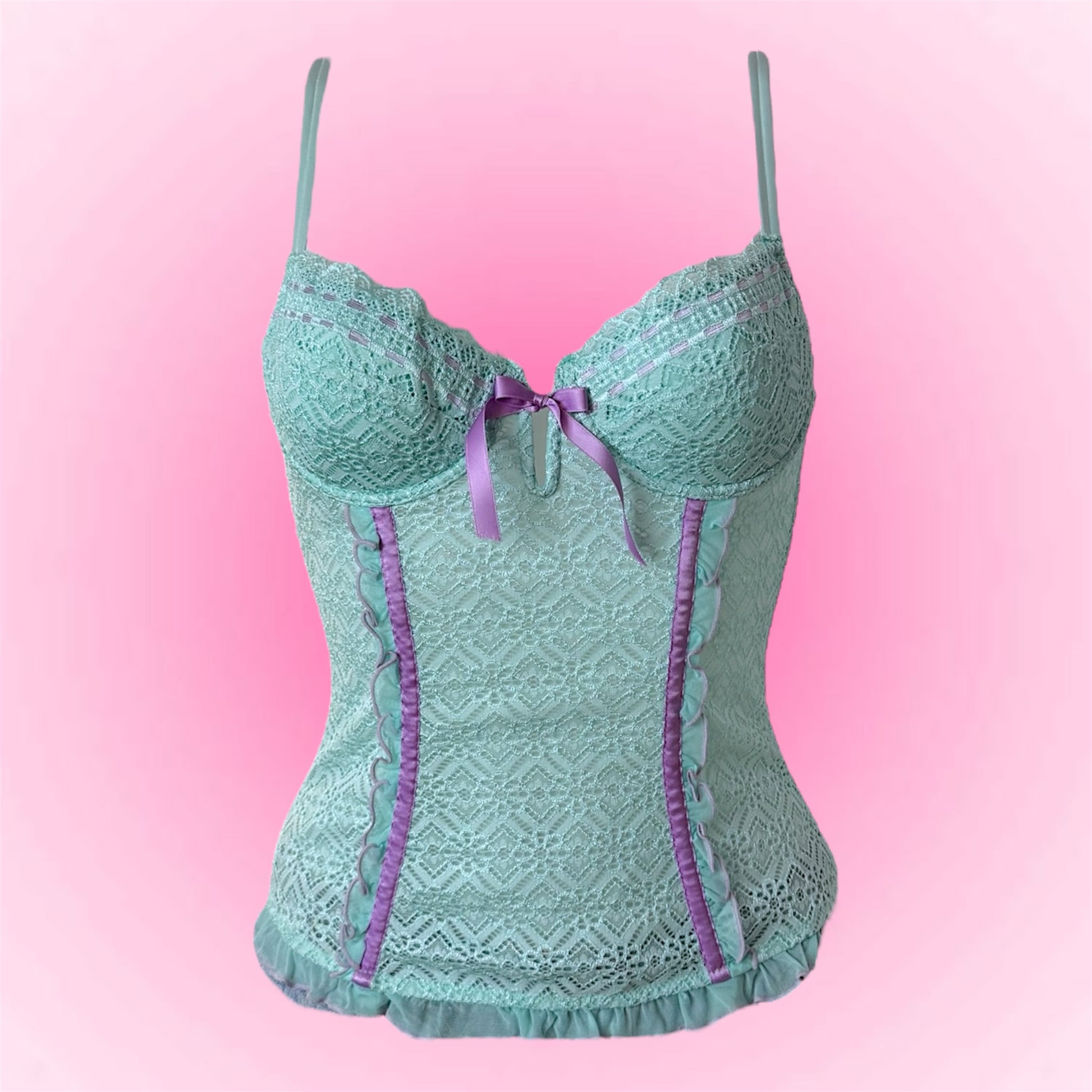 Beautiful 2 piece designer set from Naory. Deadstock designer pieces. The corset is turquoise with purple Details. It has hooks in the back and the straps are adjustable. The panties have see through material.