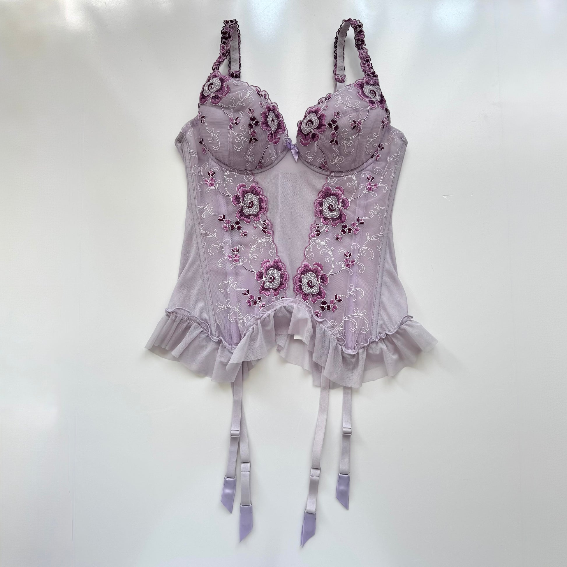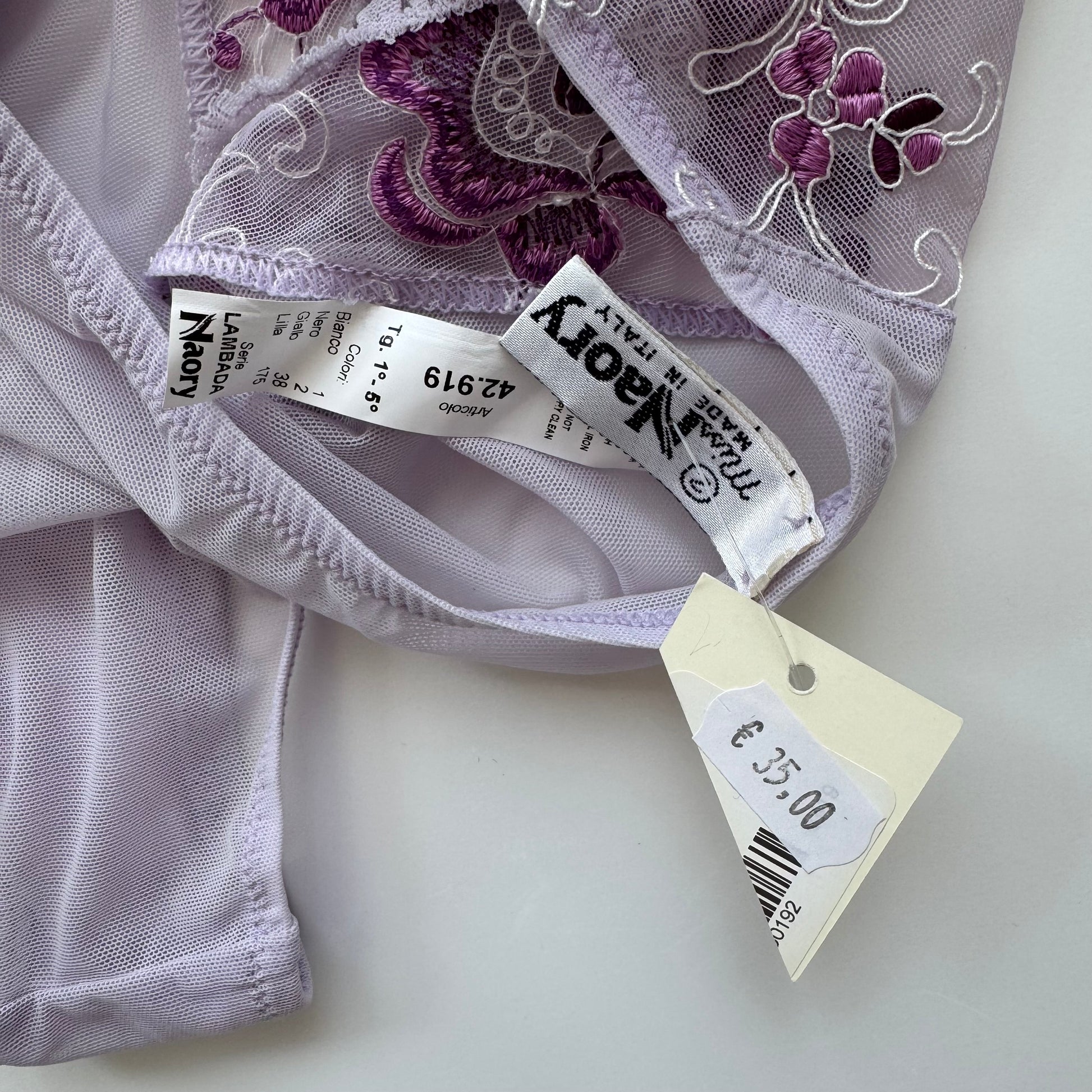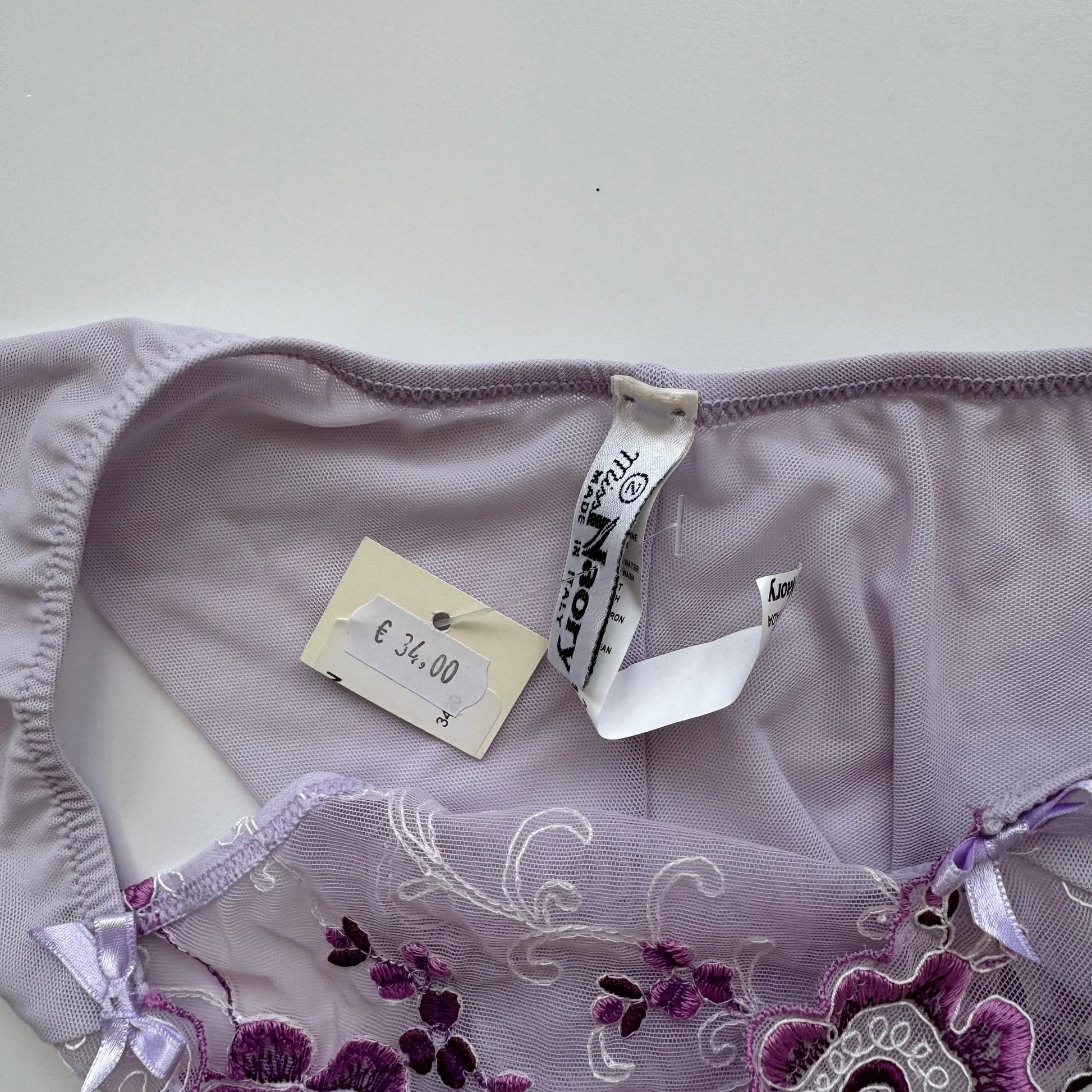 Beautiful 3 piece designer set from Naory. Deadstock designer pieces. The corset is purple with flower details. It has hooks in the back and the straps are adjustable. The panties have see through material. All pieces are new with tags!