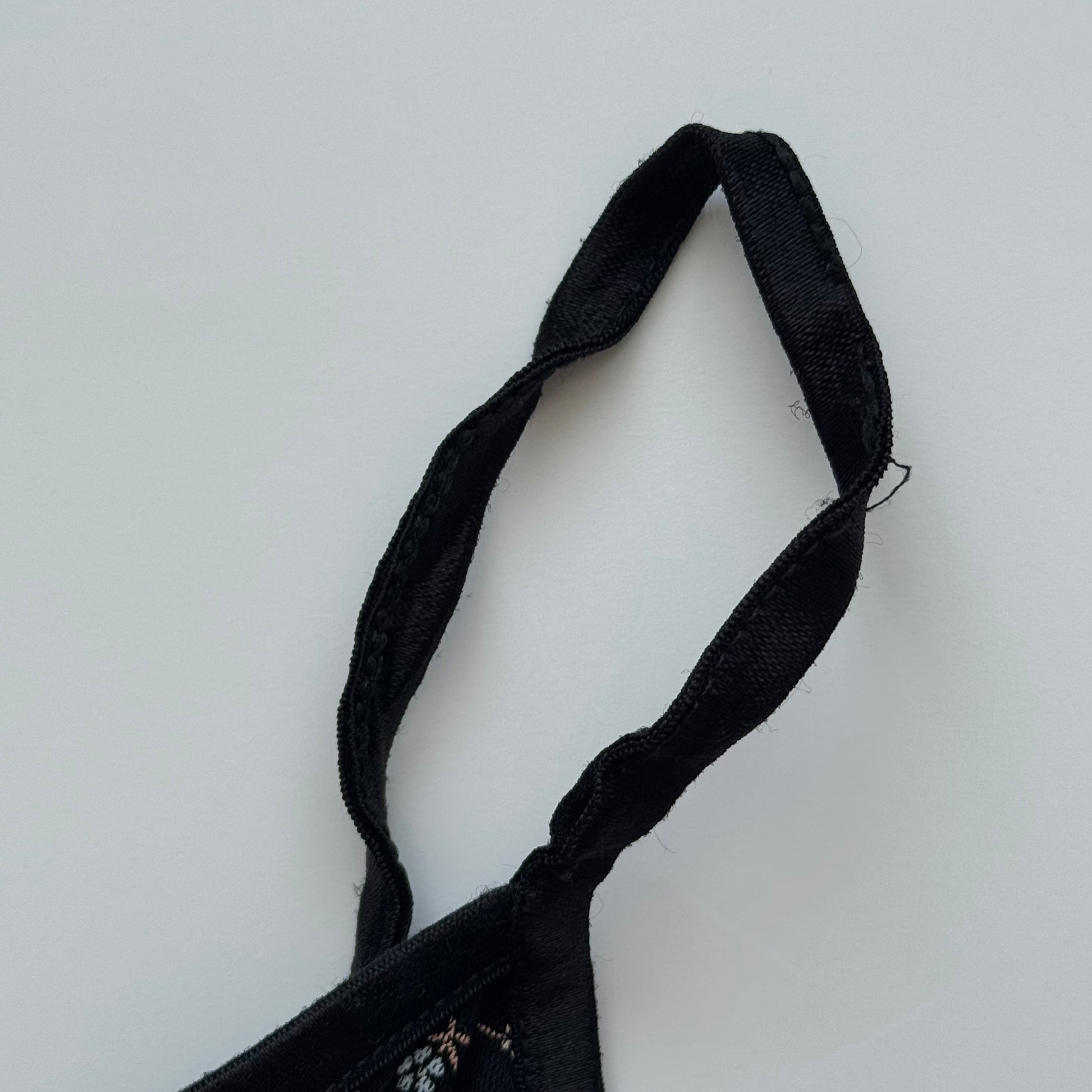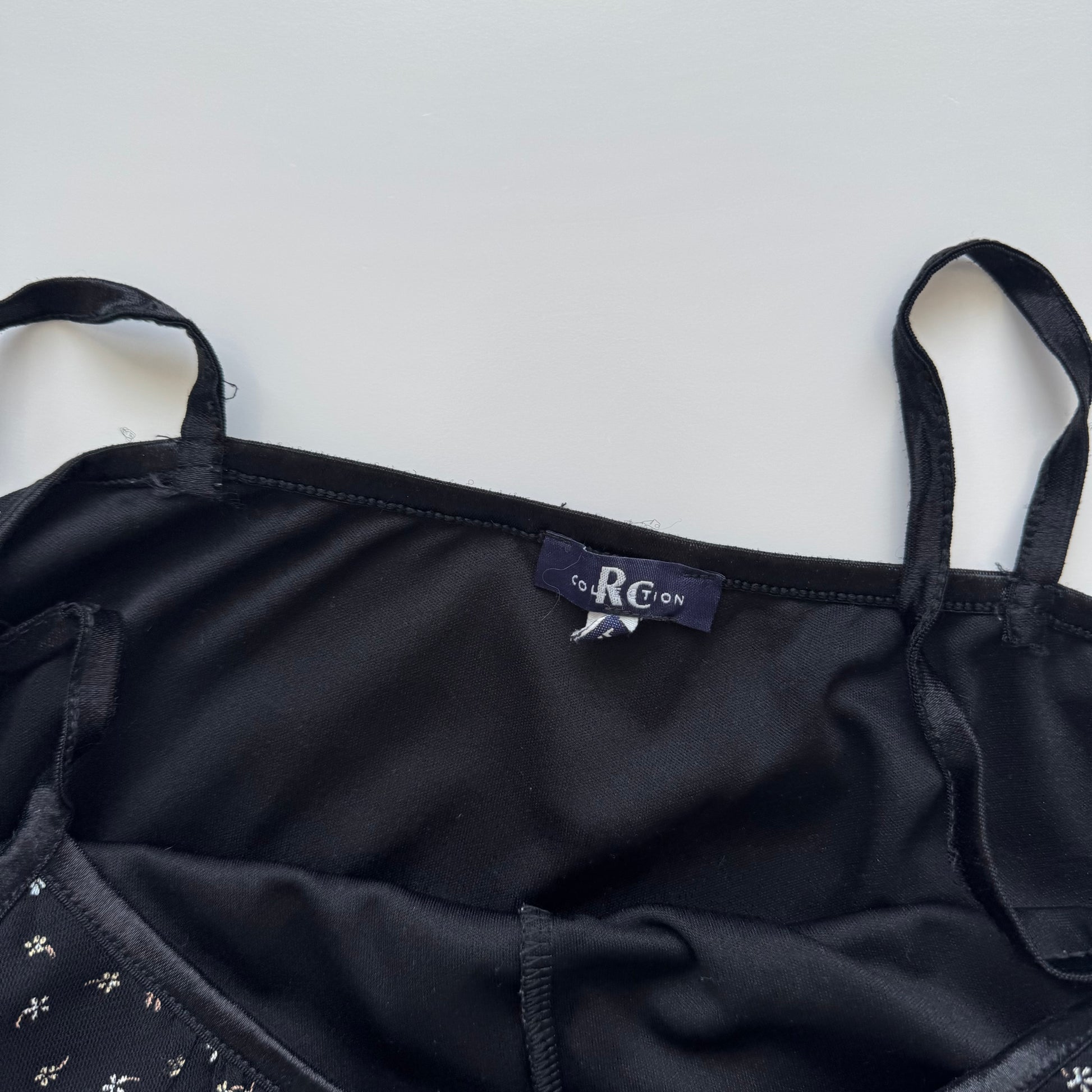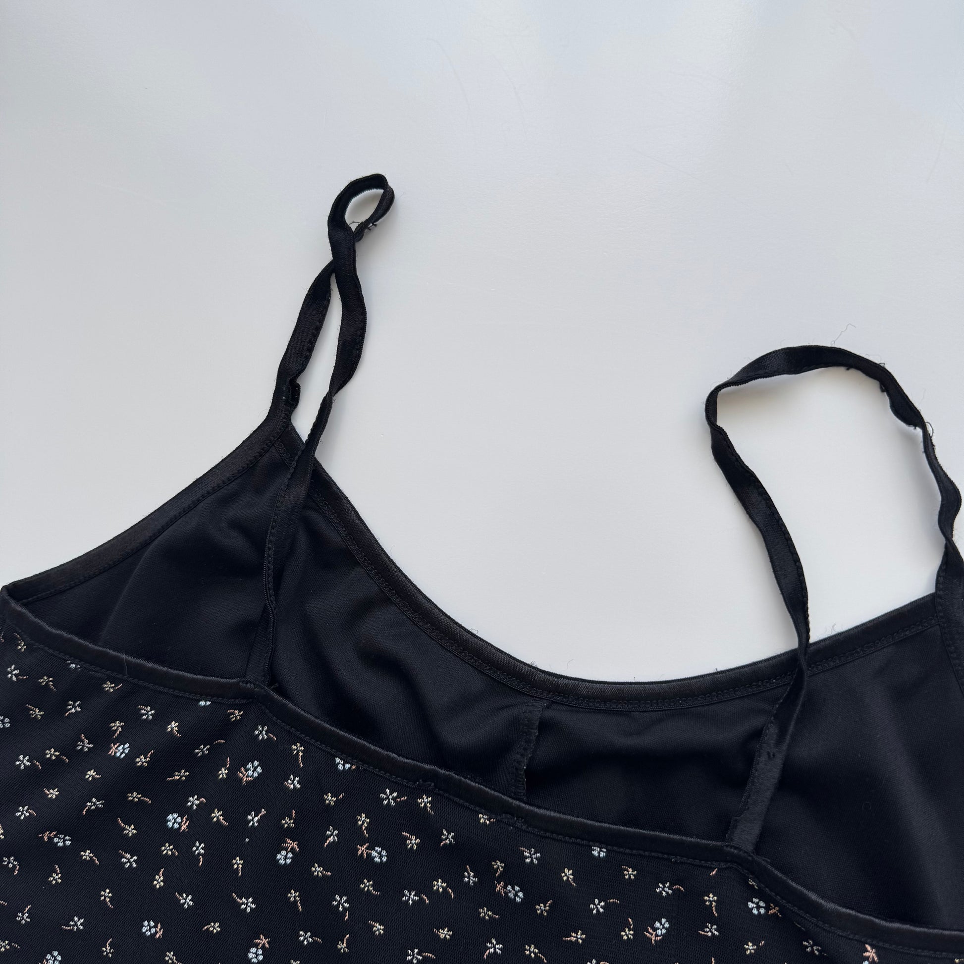 Black dress with delicate white floral print and thin straps. Slight ruching on the chest and subtle ruffle hem. Size XL fits like M/L