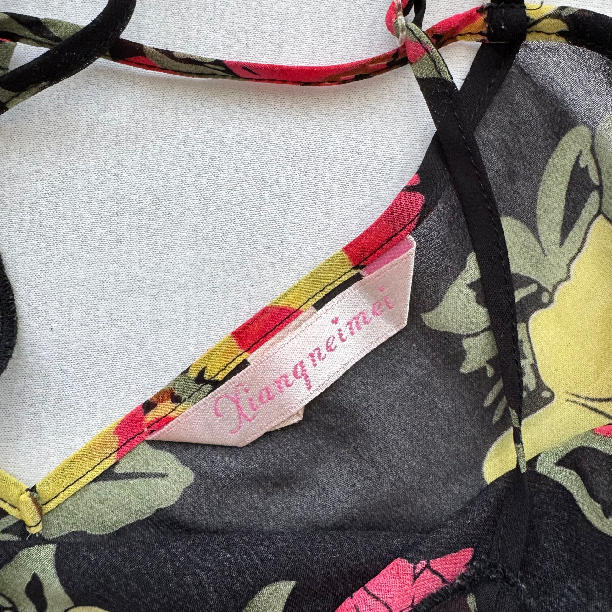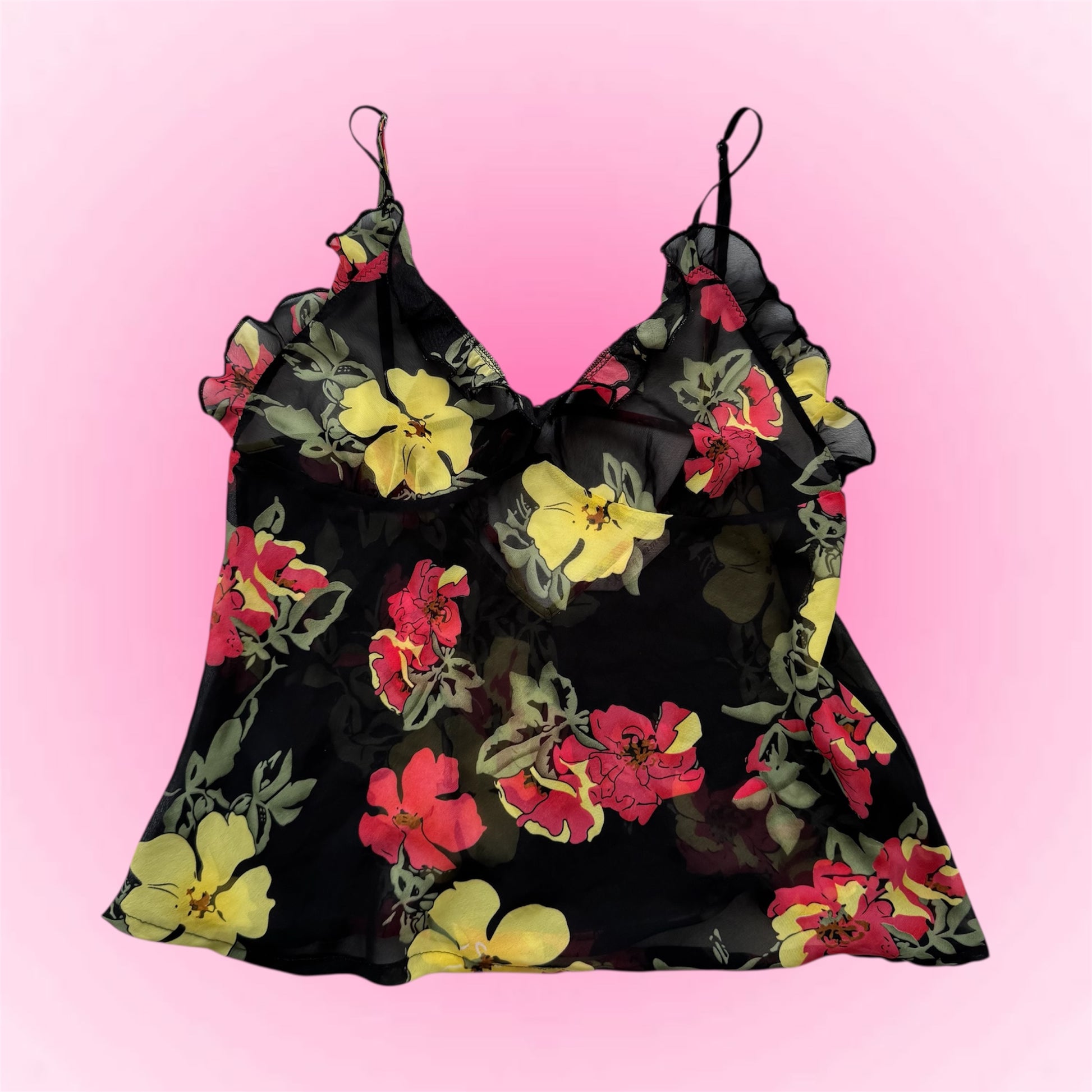 Adorable black top with colorful flowers and a bow in the back. See through material and adjustable straps. Size M