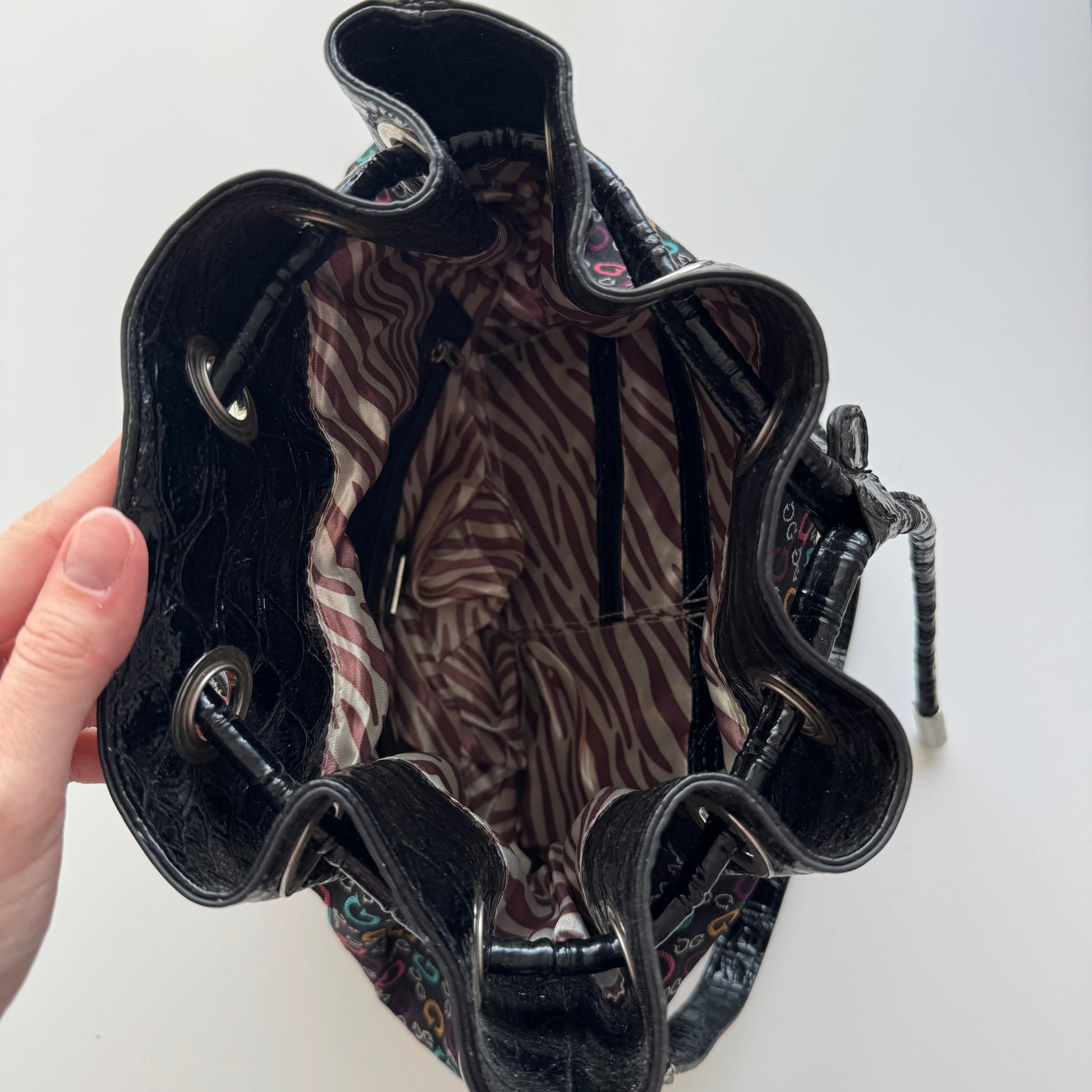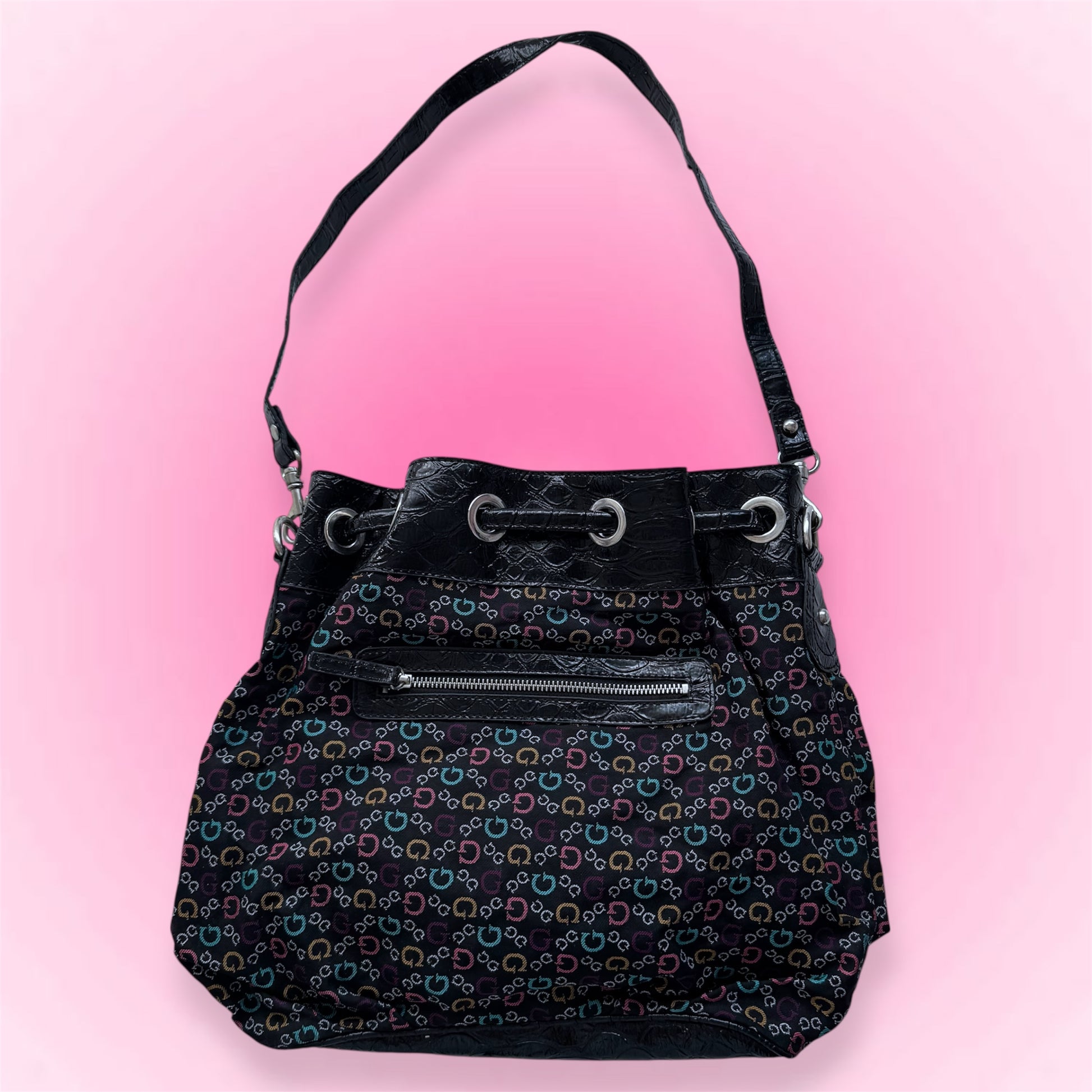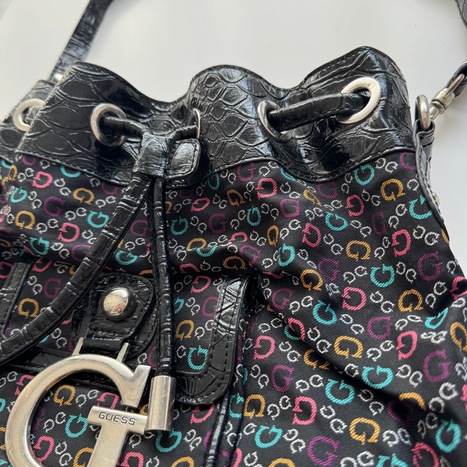 Cool black Guess bag with multicolor monogram print. In good condition.