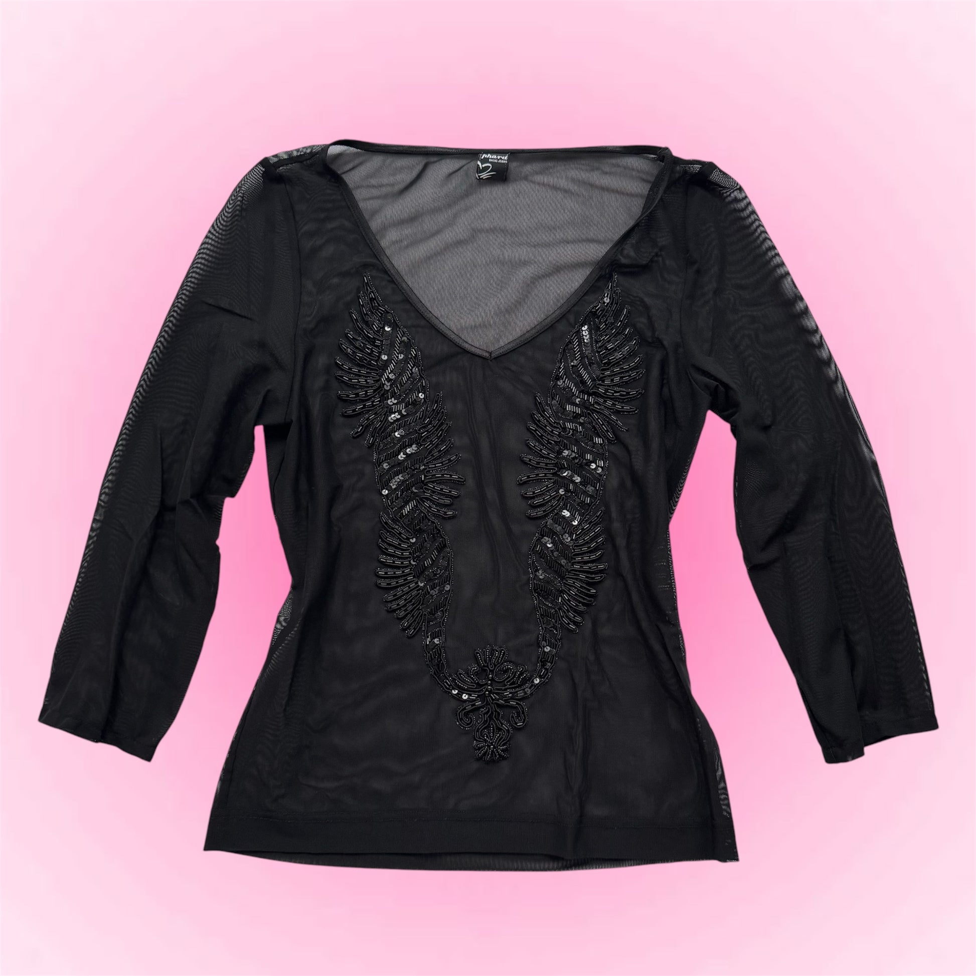 Black Y2K longsleeve from Phard with see through material. Wings in the front with pearls and sequins. Size fits M