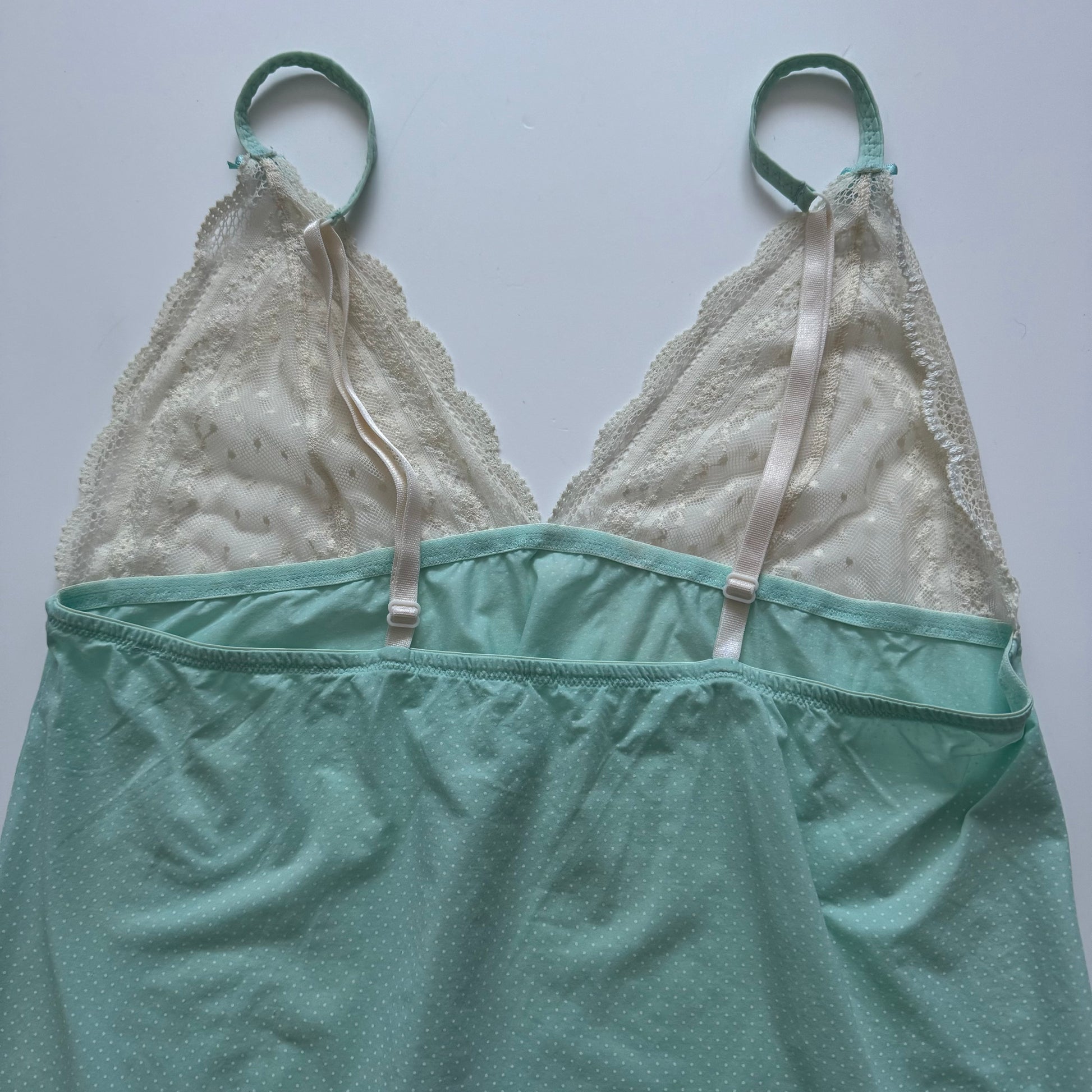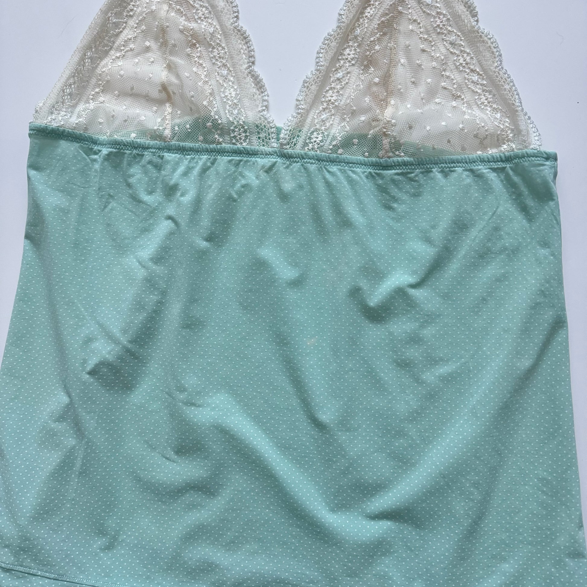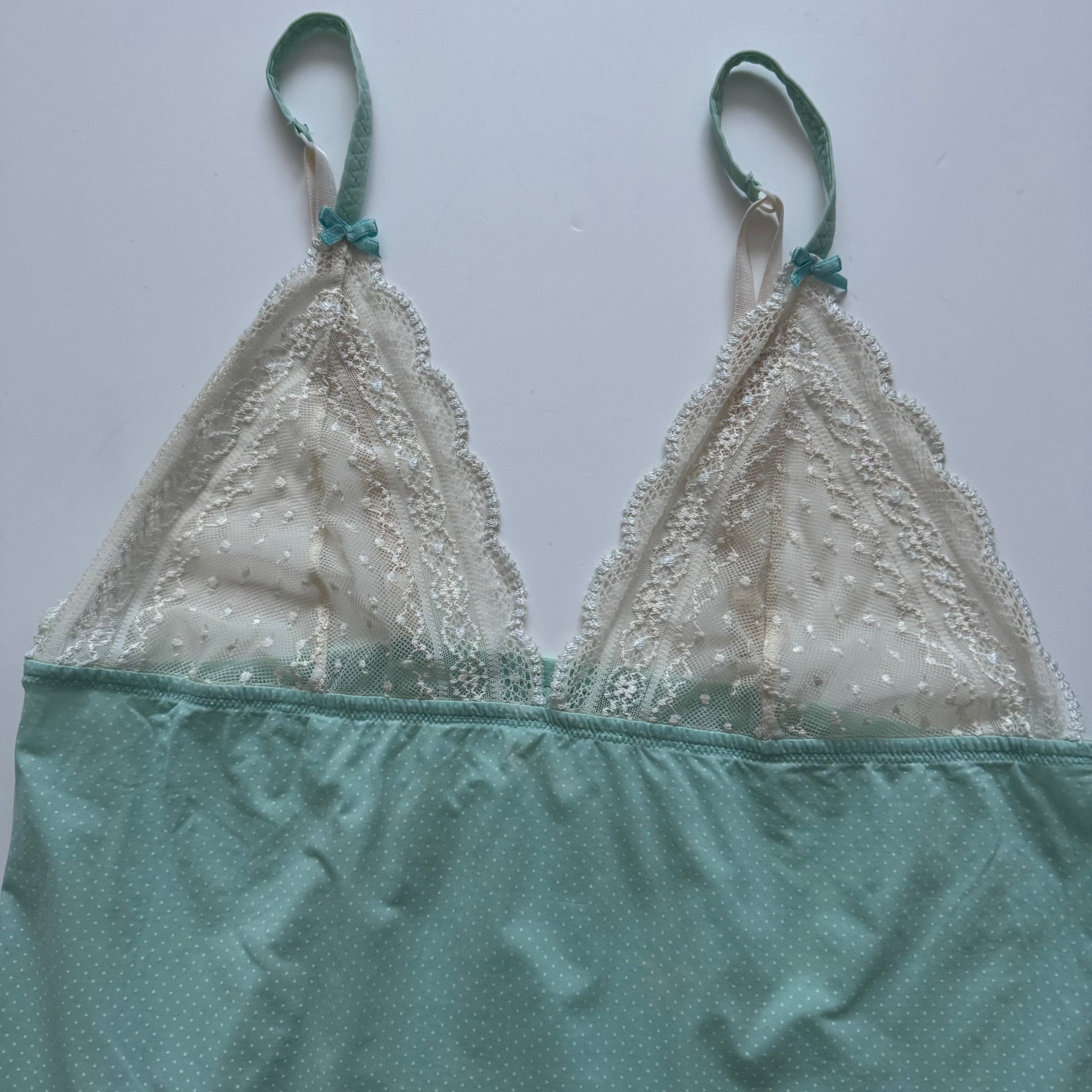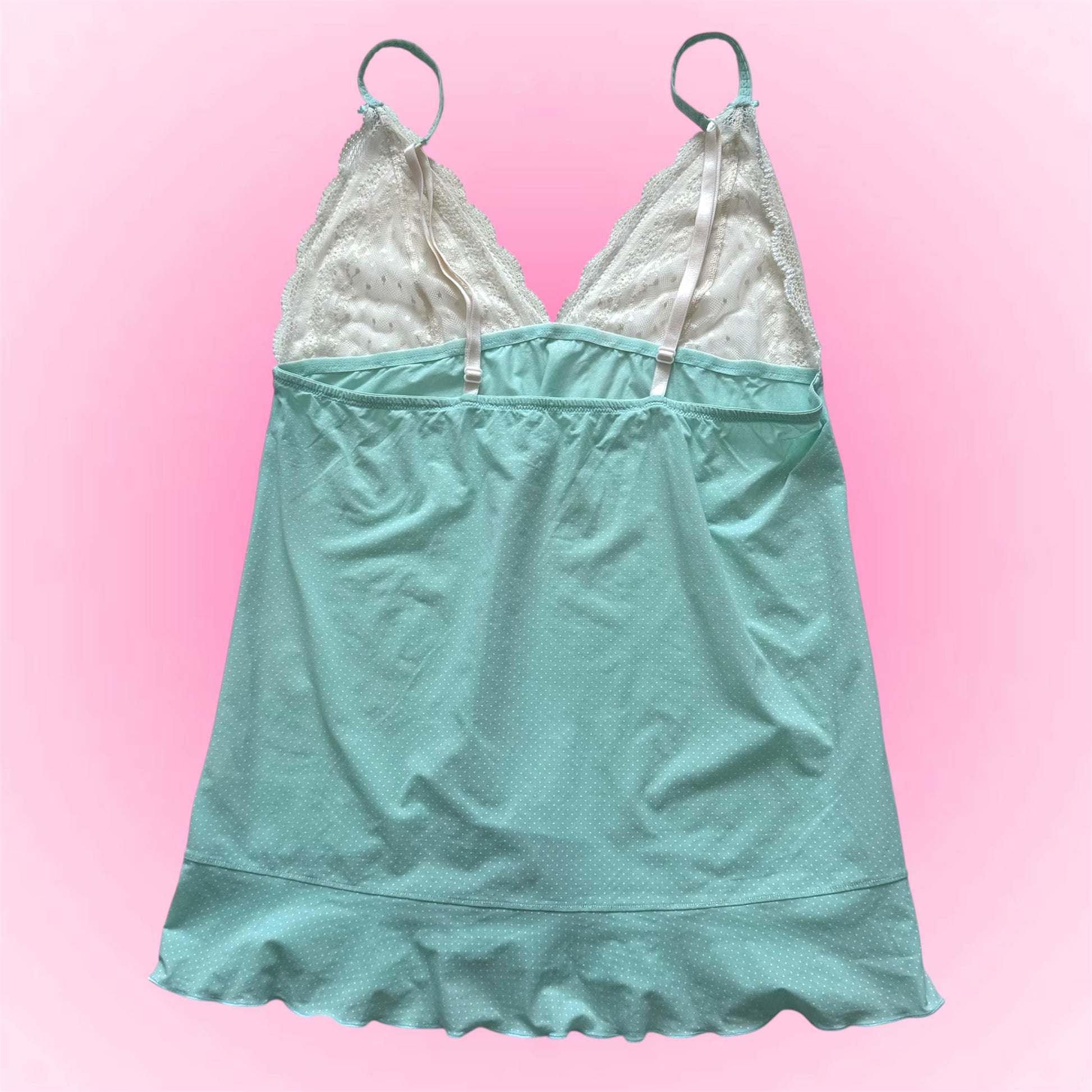 Cute long blue Babydoll cami top with lace details and adjustable straps. Slight discoloration. Size M