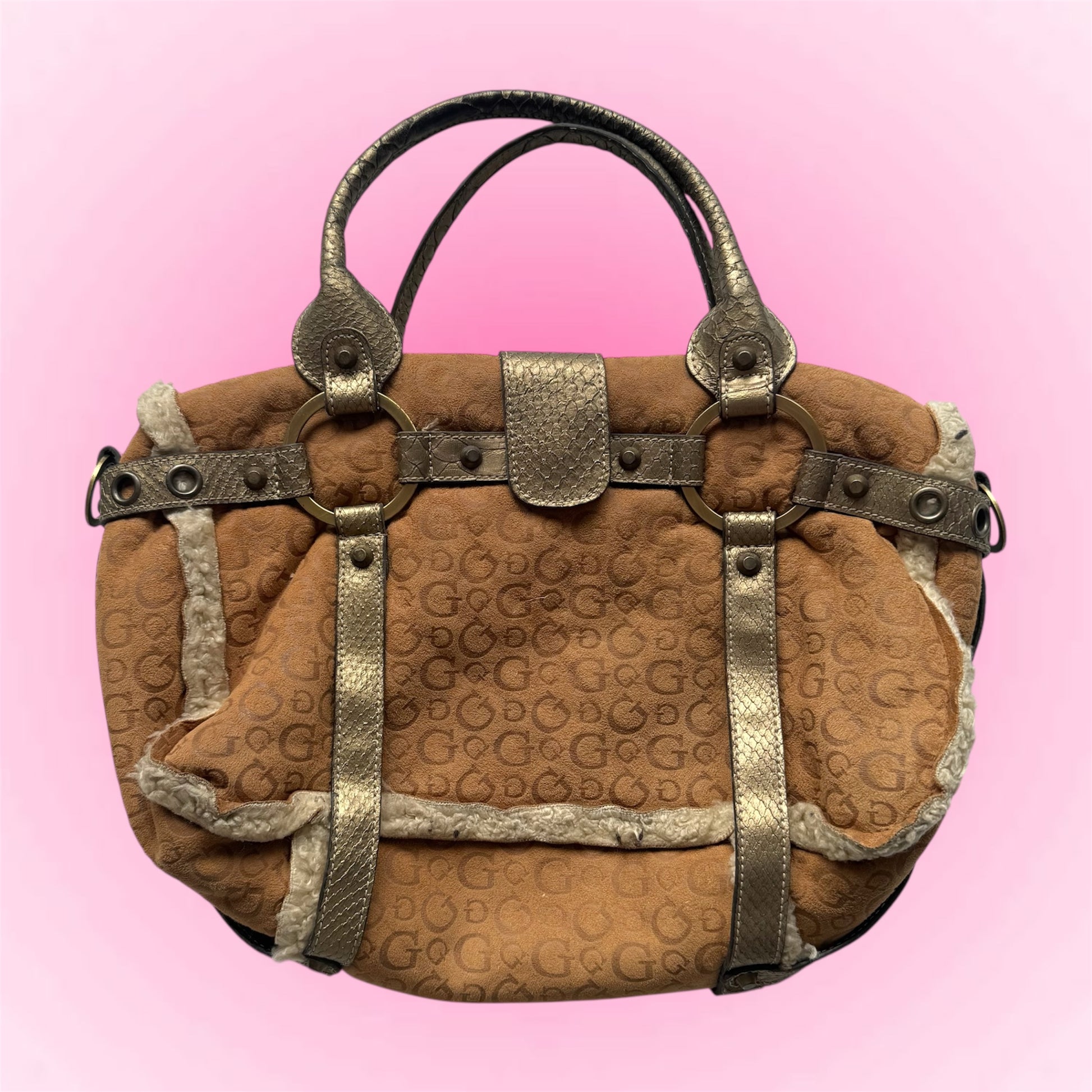 Cute brown Y2k bag with fake fur details and gold hardware.