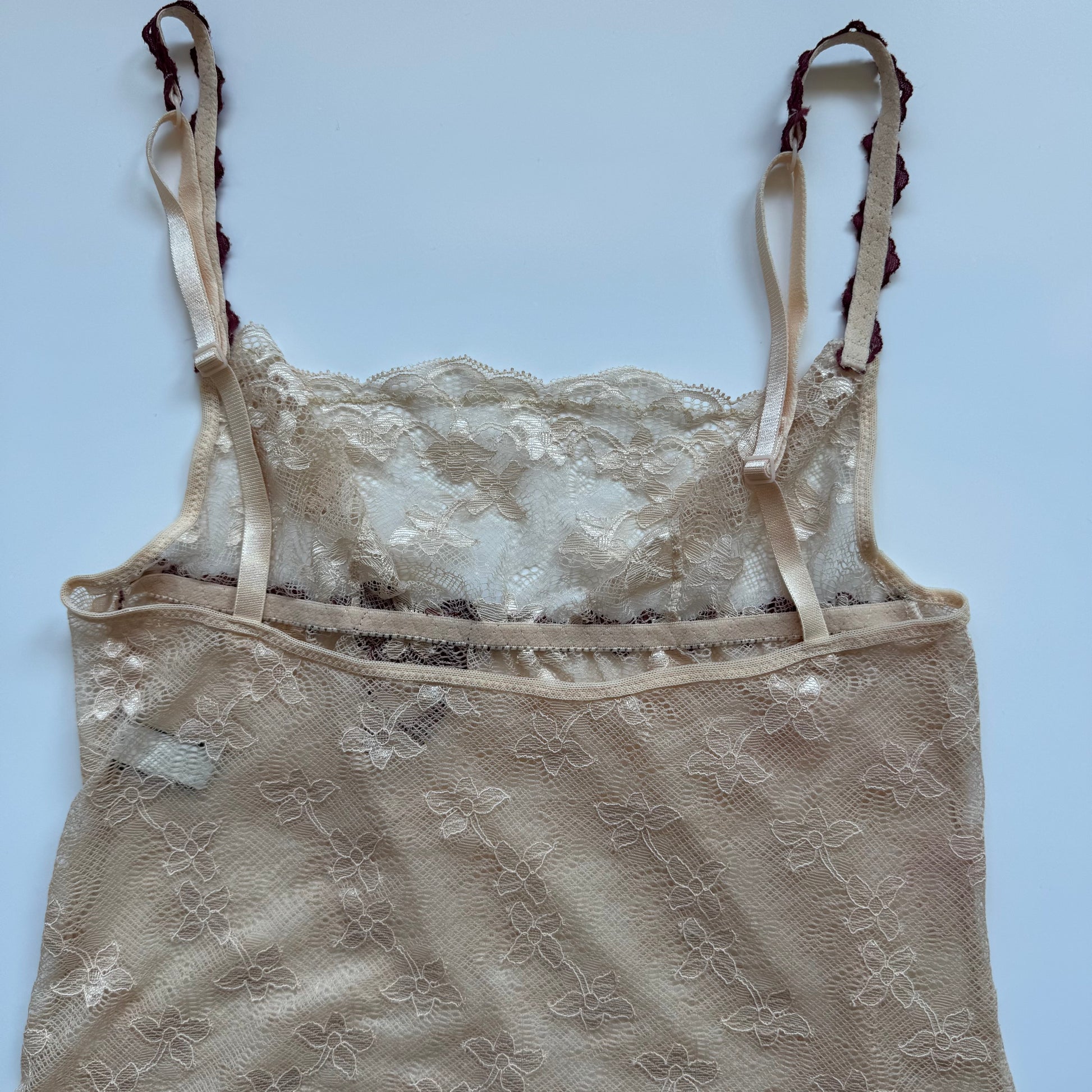 Beautiful lace top with burgundy details. The little bow has rhinestones. Adjustable straps. Size fits M