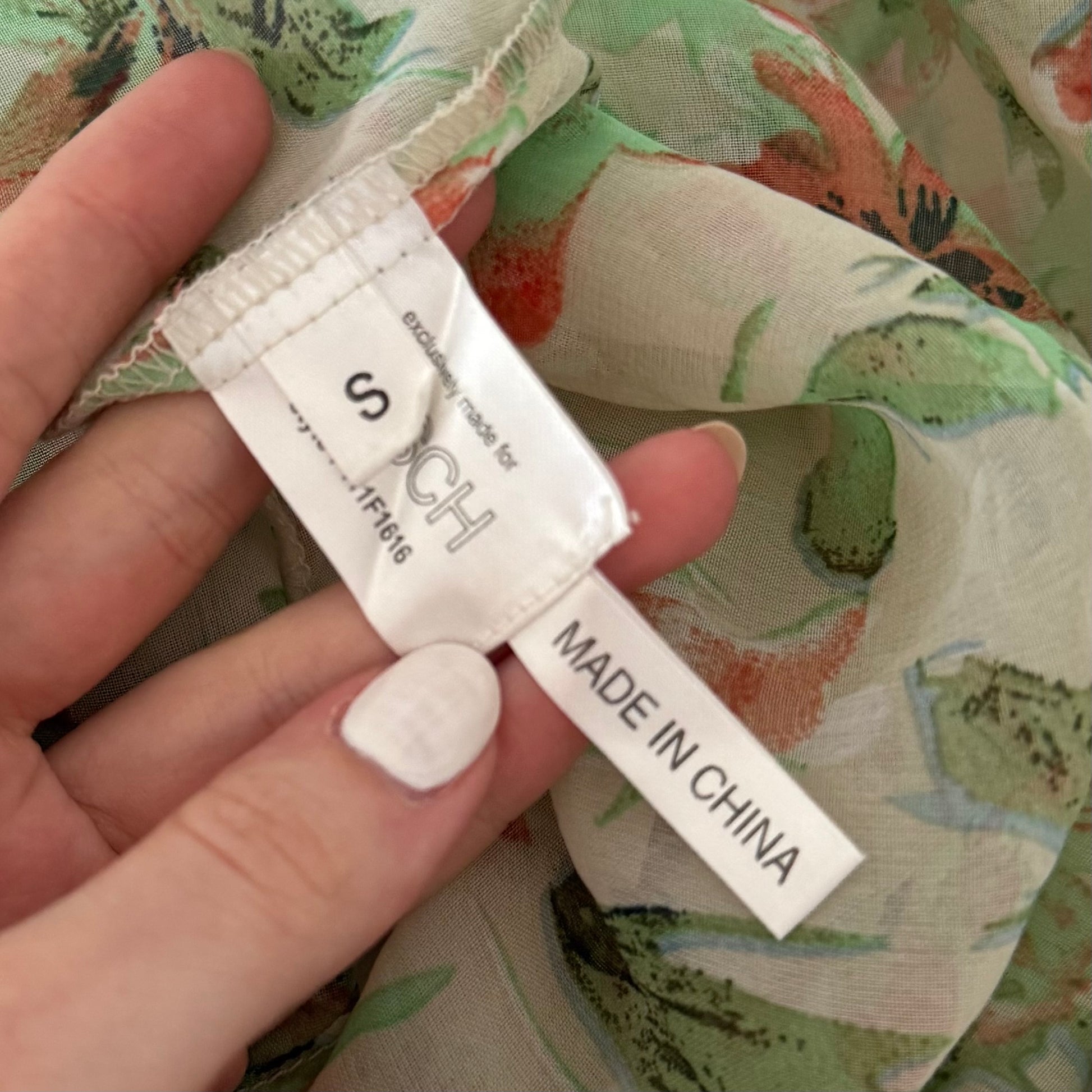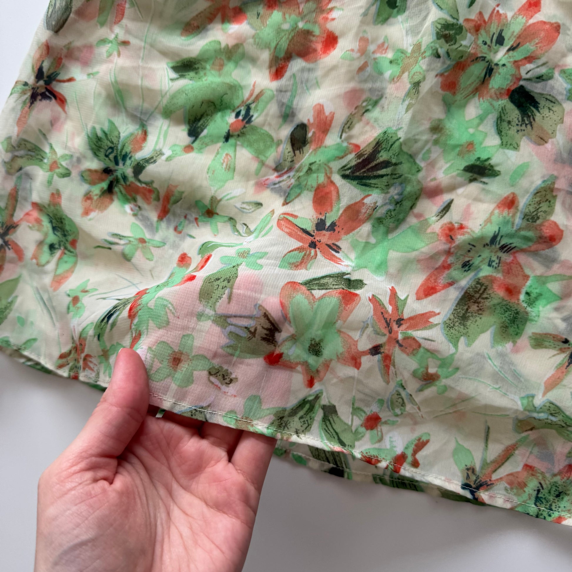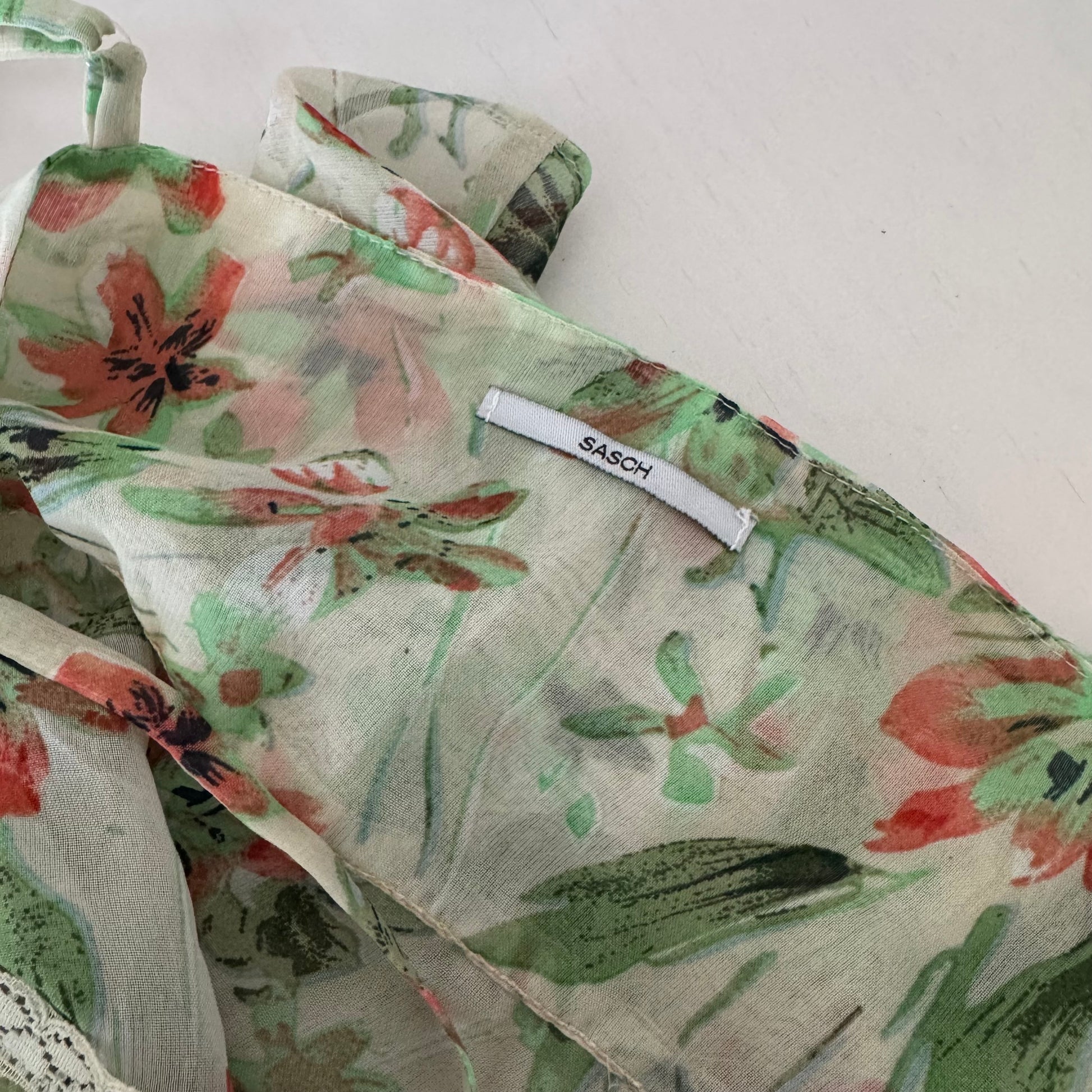 Green and white floral cami top with adjustable straps and lace details. Material is see through and not stretchy. Size S