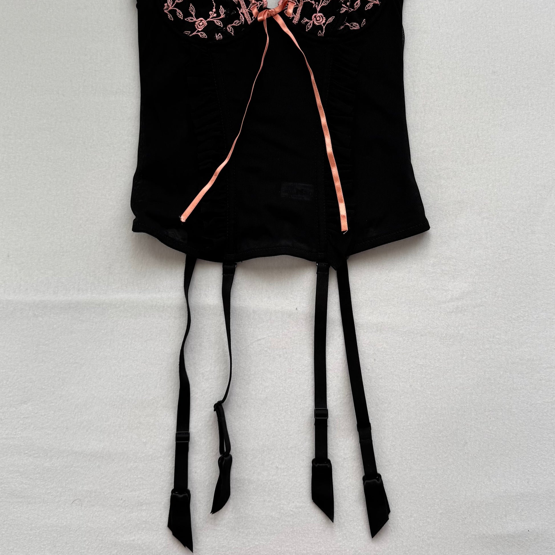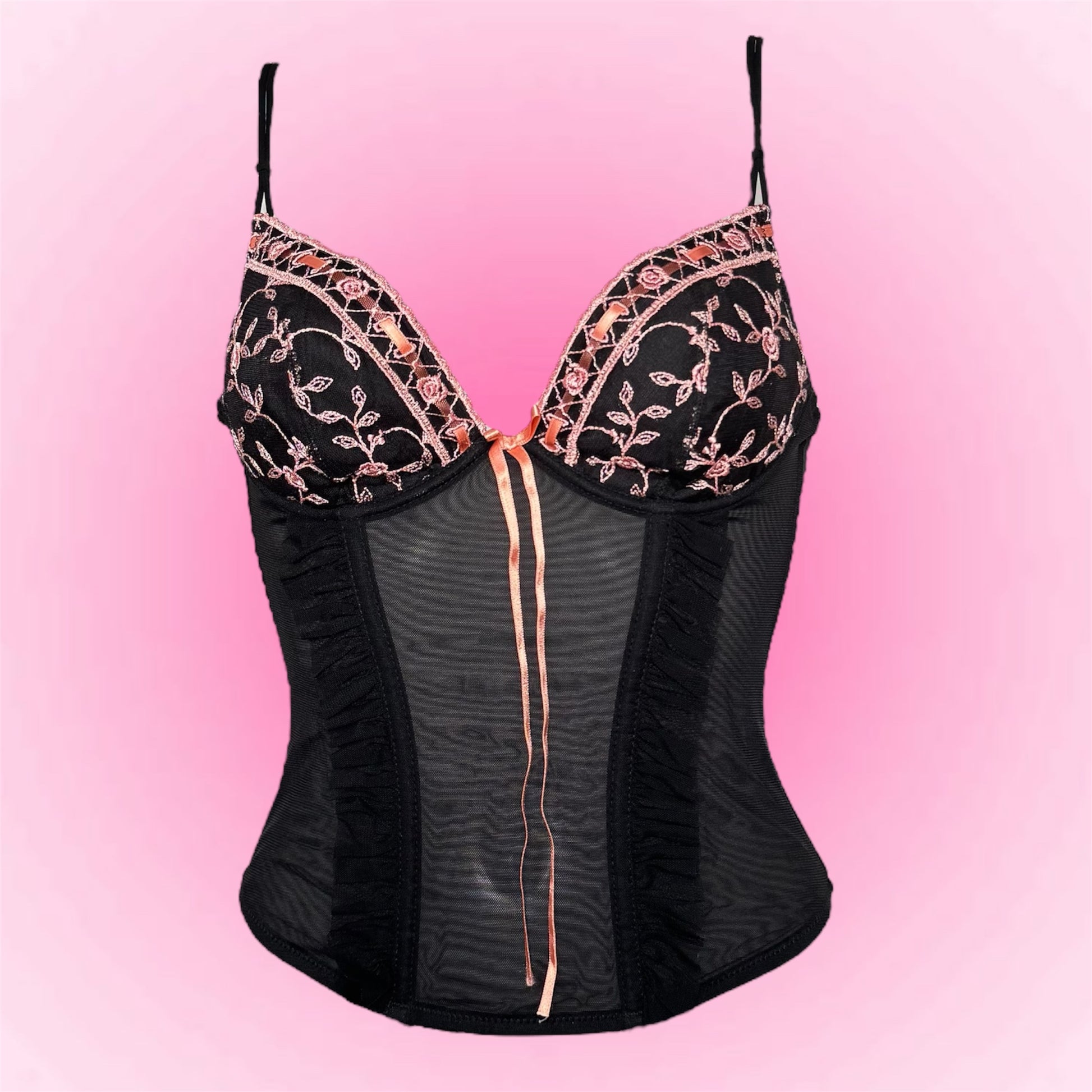 Beautiful black vintage deadstock designer corset from Miss Naory. Pretty orange flower embroidery and a bow. The straps are adjustable. EU 70B