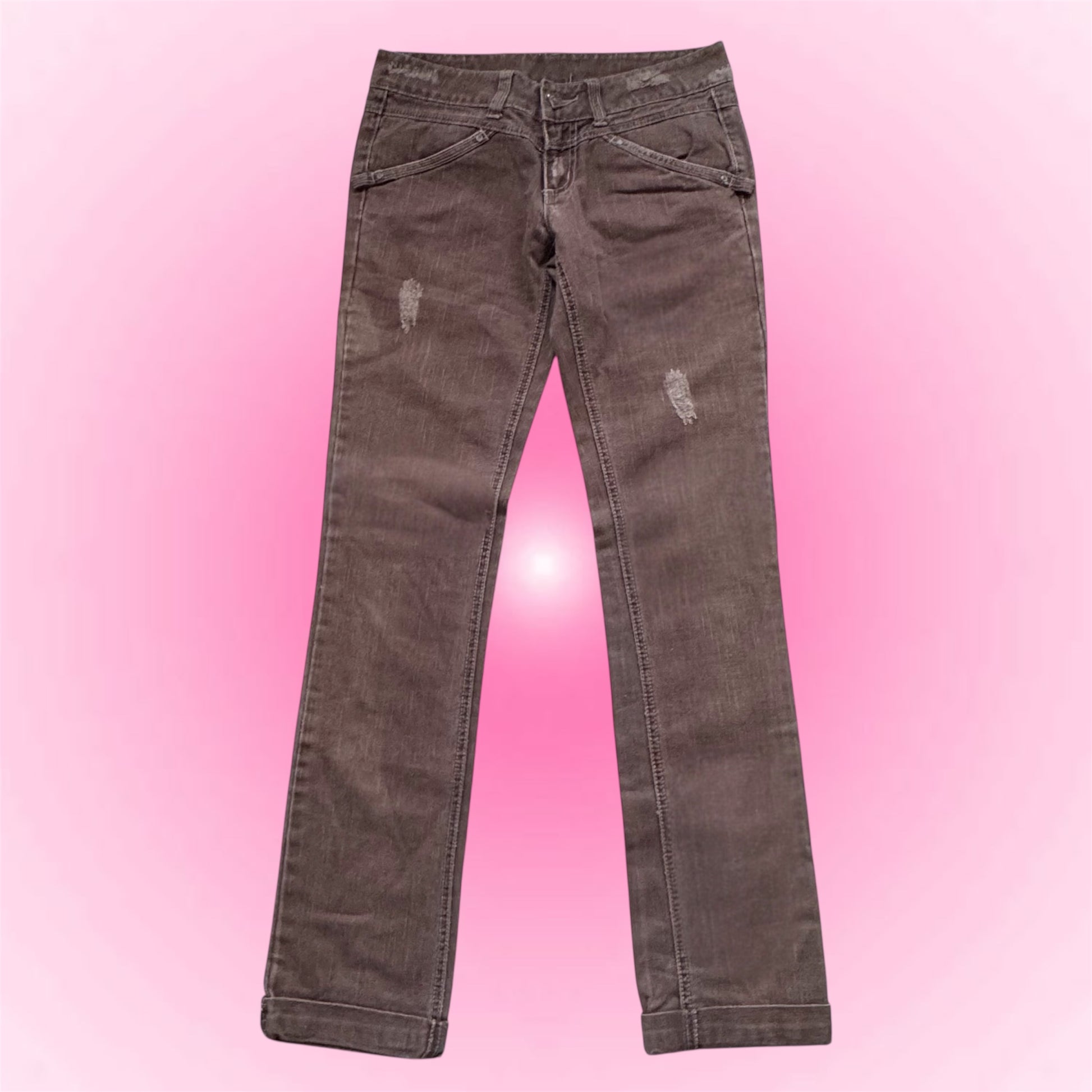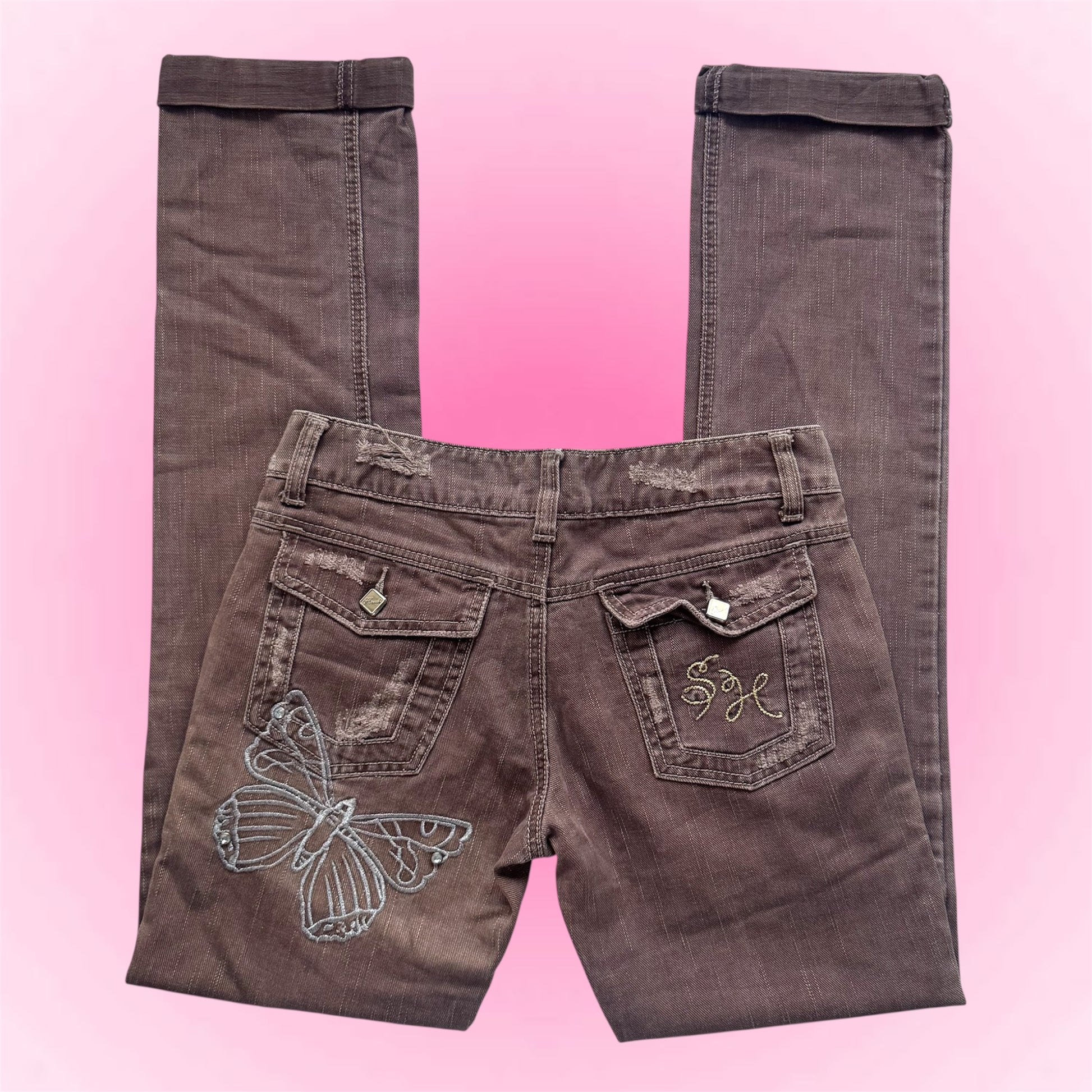 Brown straight leg jeans with embroidered butterfly detail and stitched back pockets. True Y2K denim essential. Low rise.