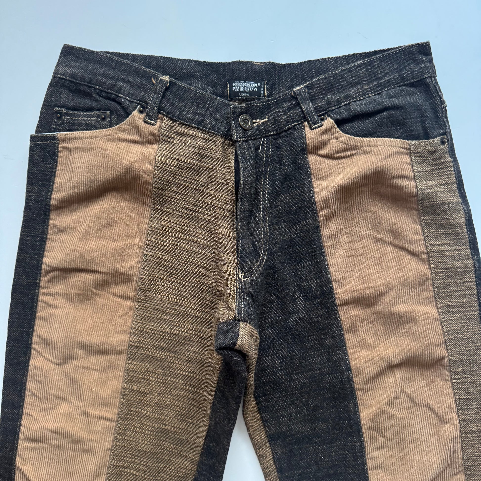 Two-tone patchwork jeans with vertical brown and denim panels. Flared leg and mid-waist. Unique vintage 2000s design.