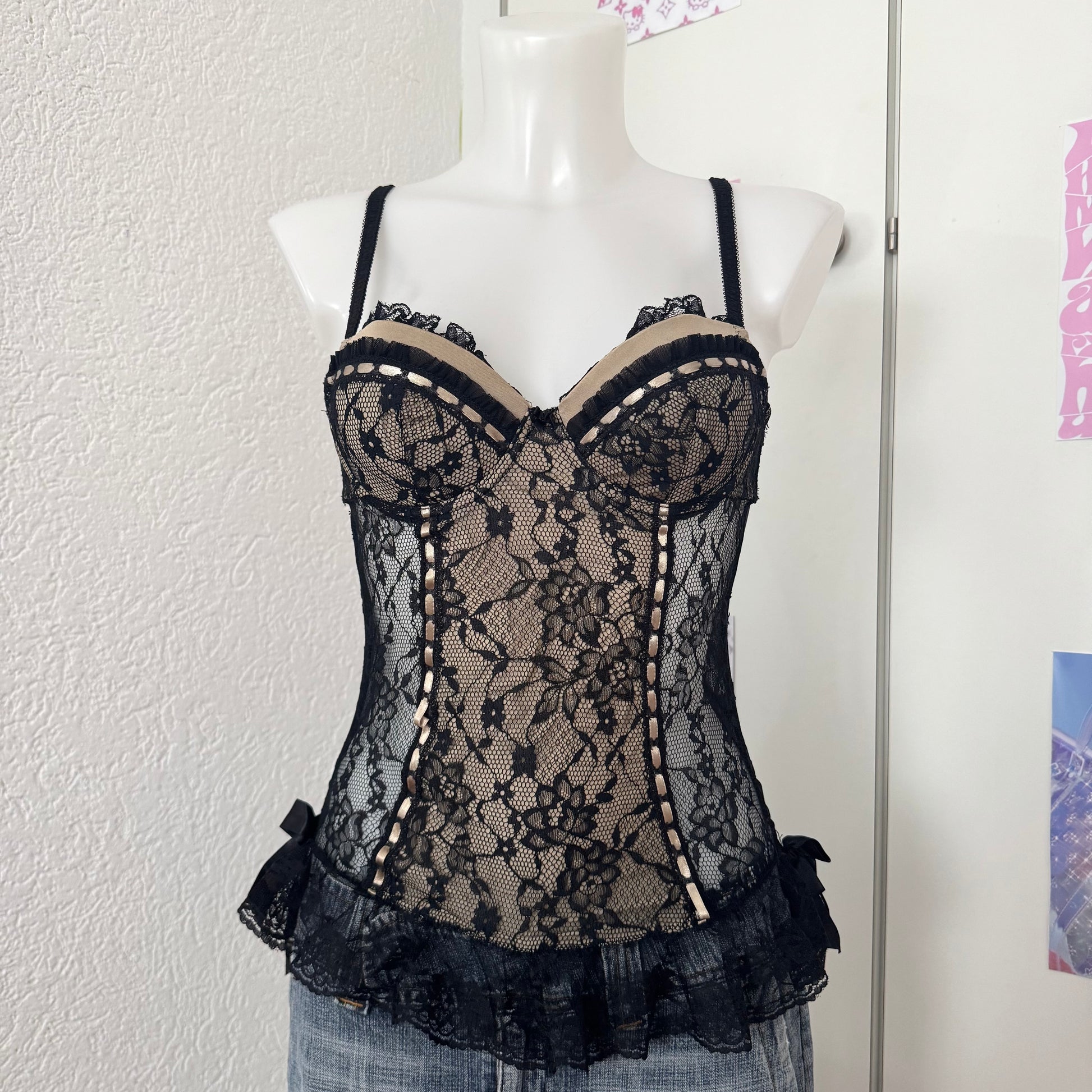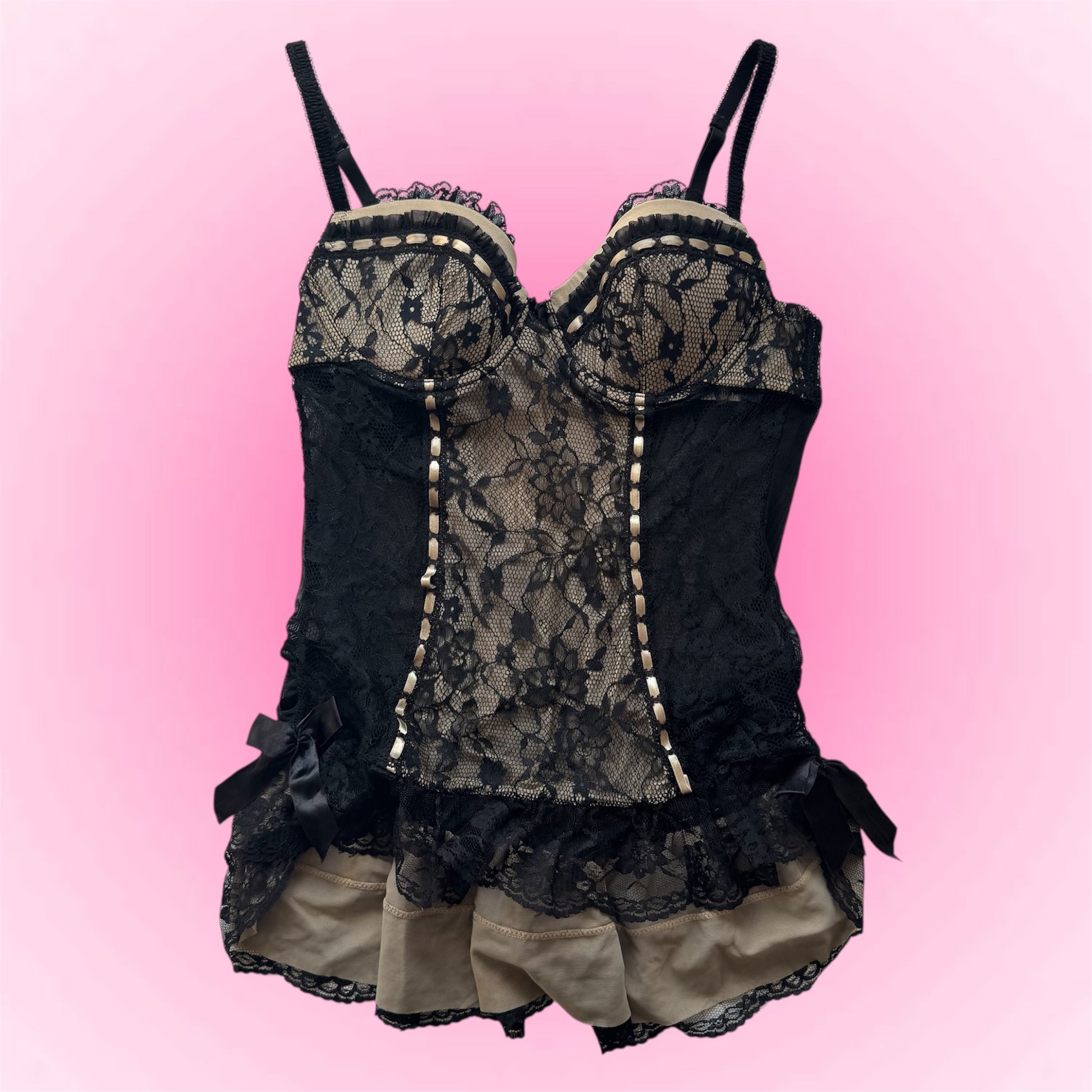 Beautiful corset with black lace details and bows. Adjustable straps.