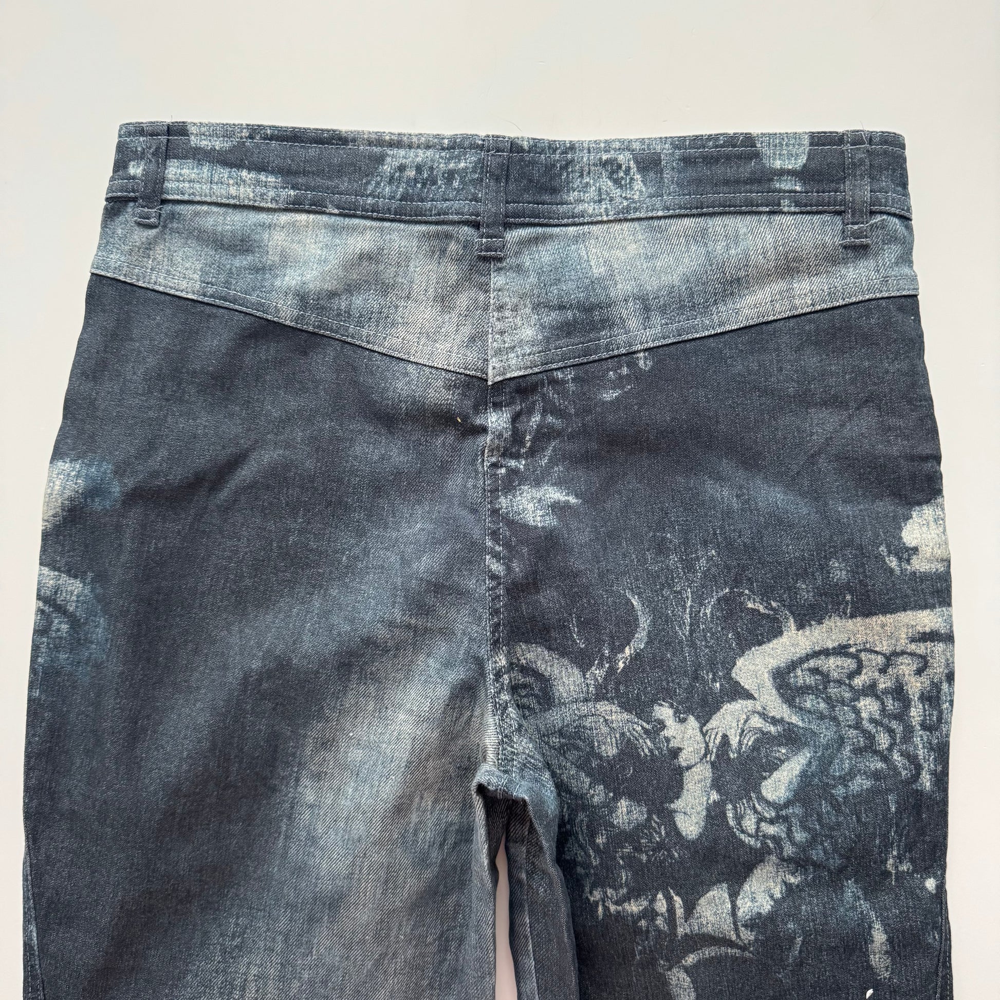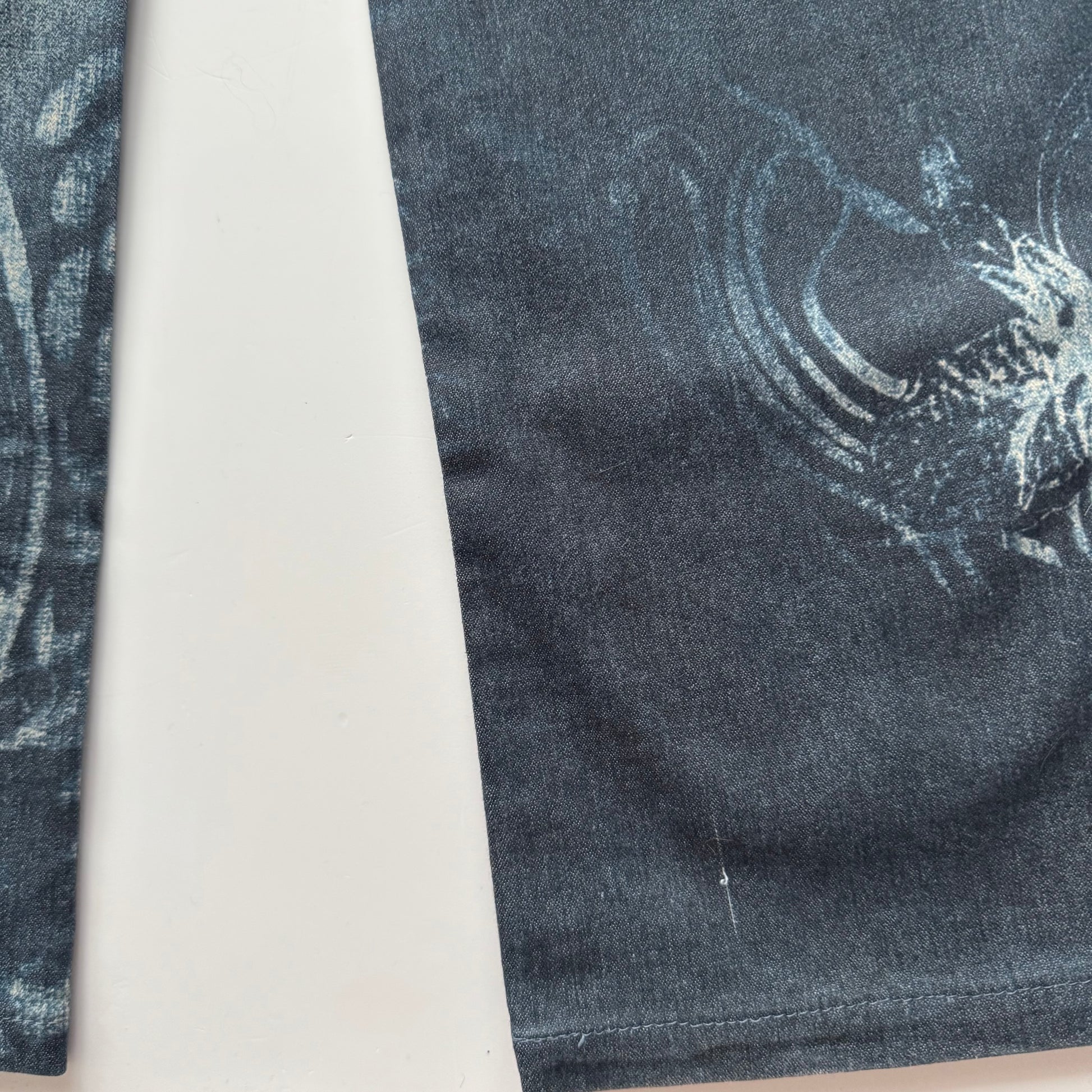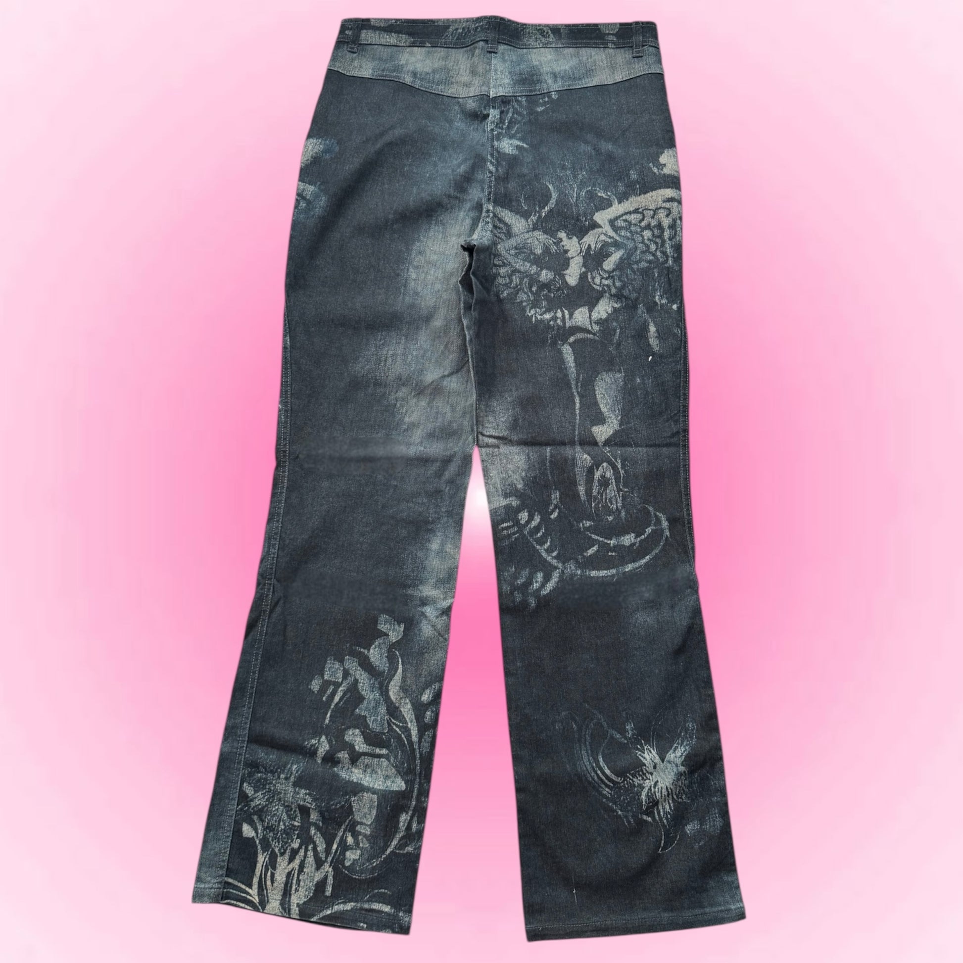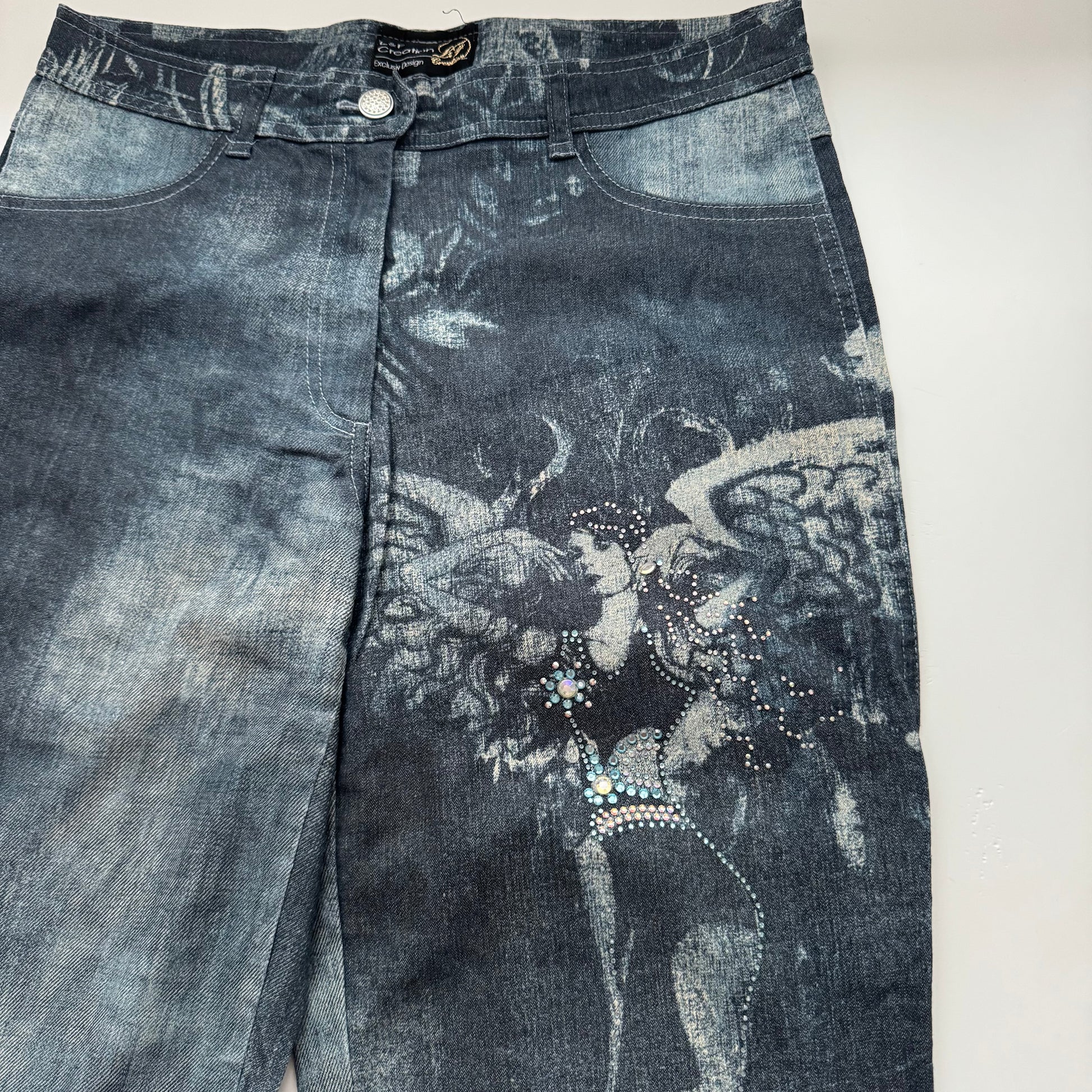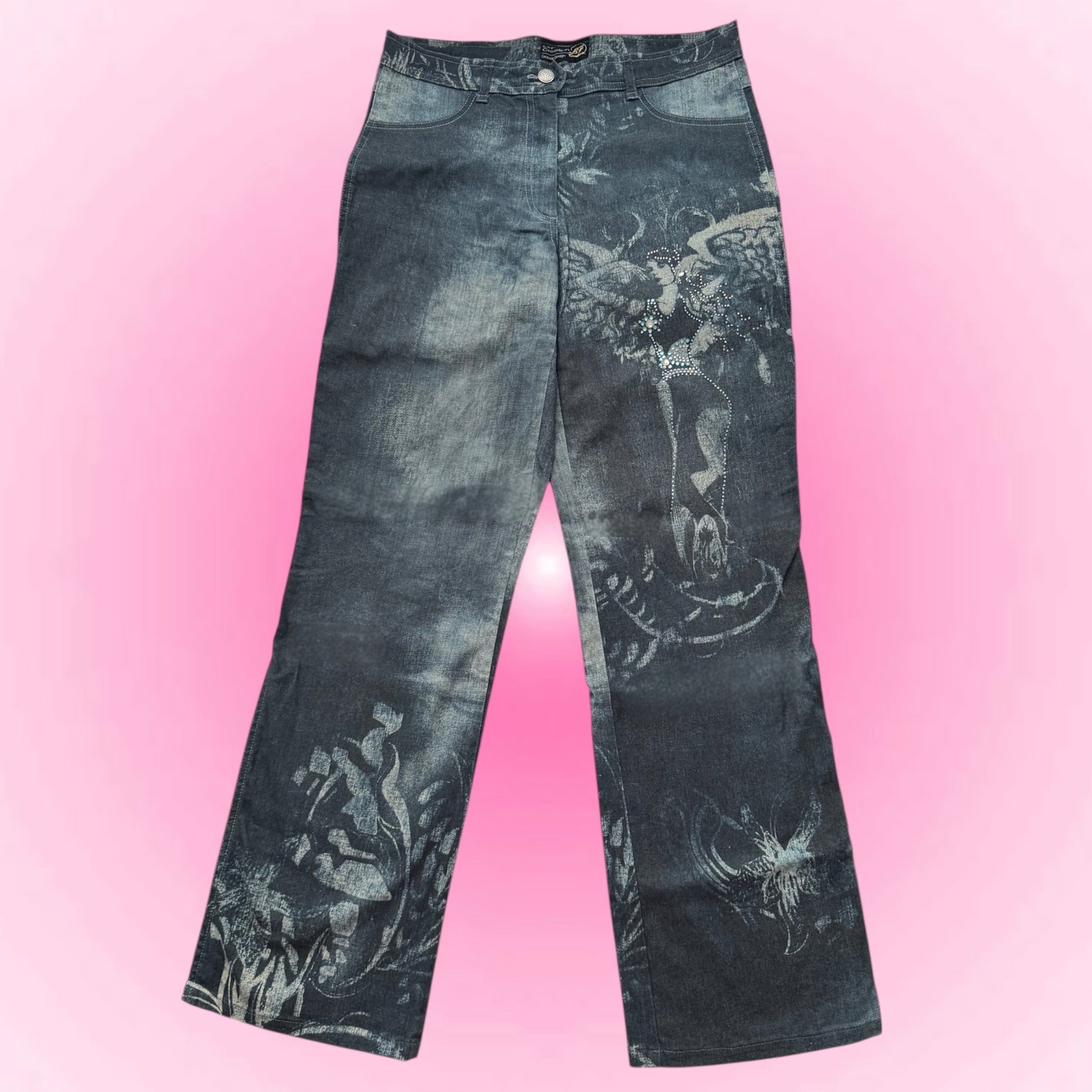 Cute jeans with fairy print on both sides, rhinestones in the front. High waisted.