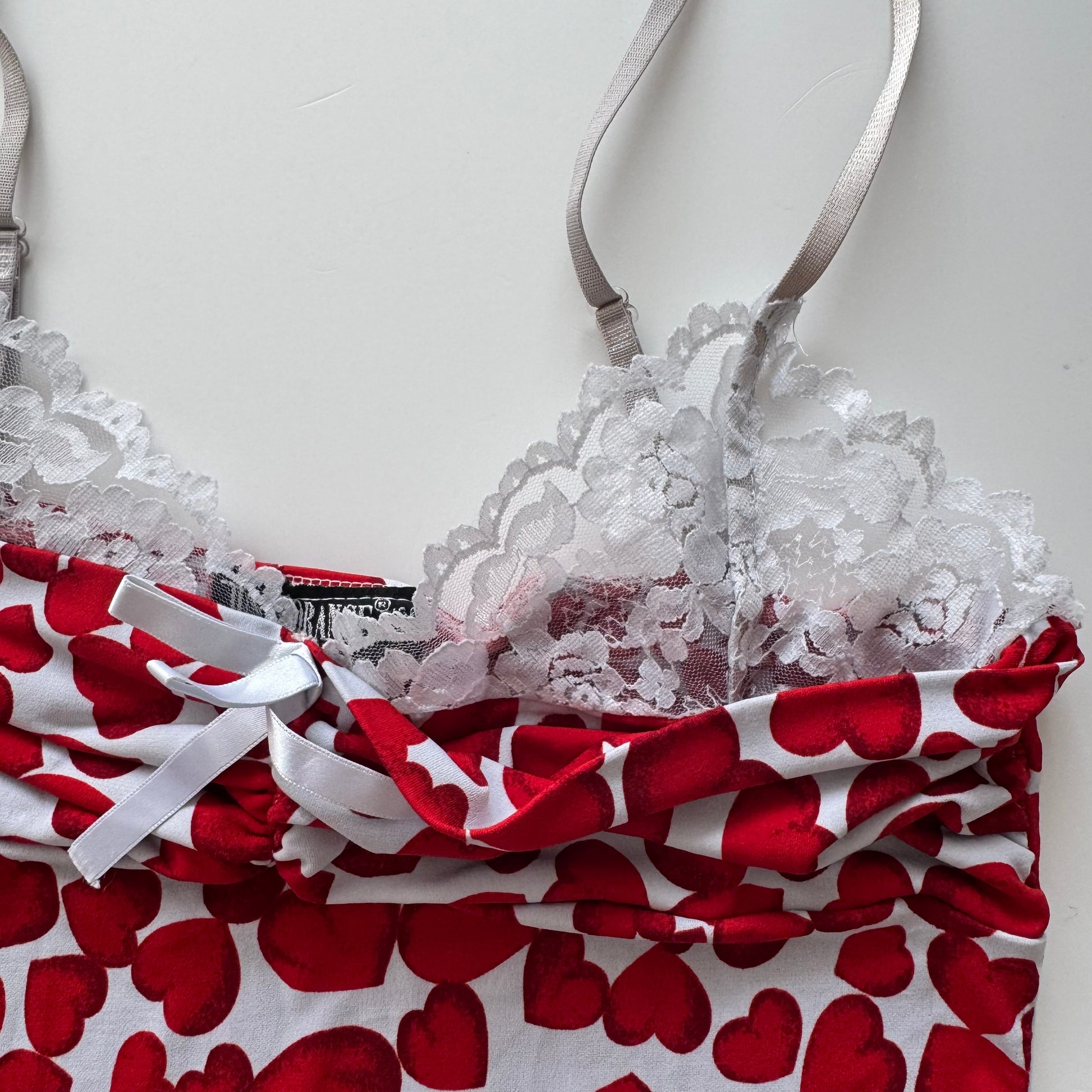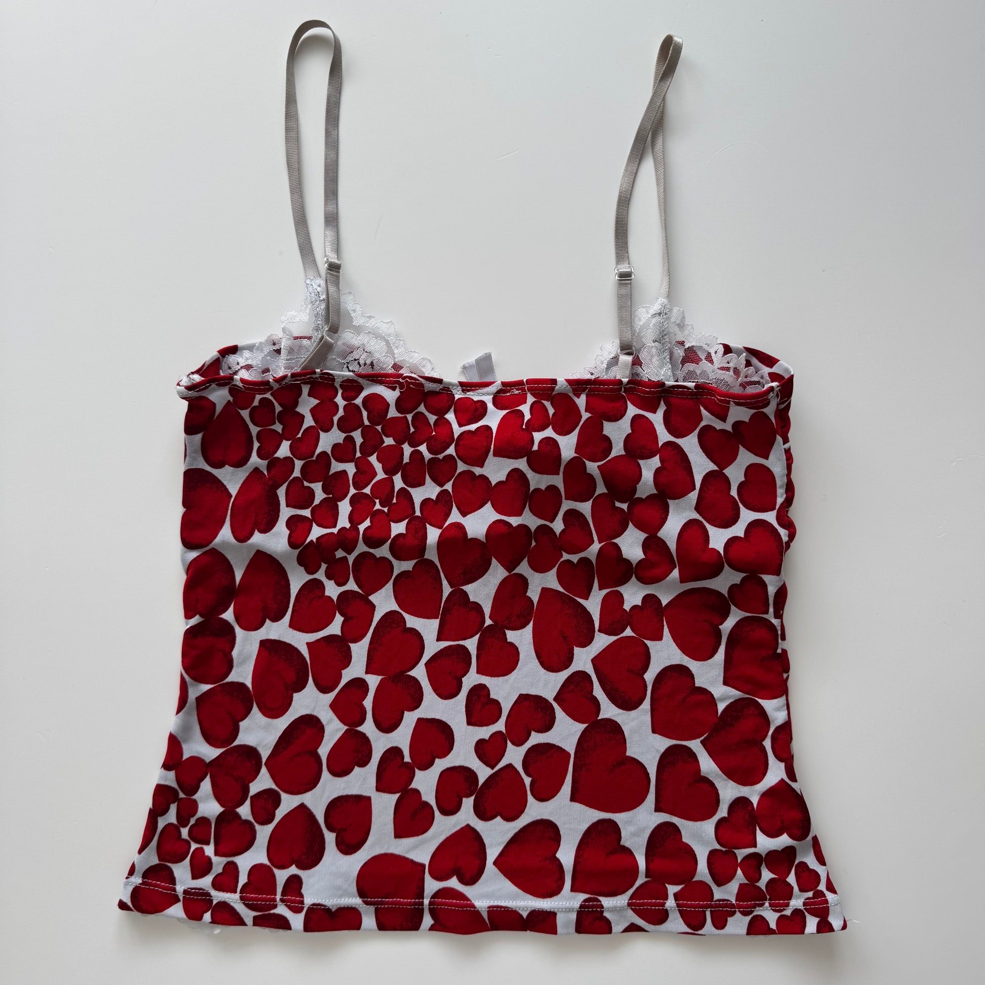 Adorable vintage top with hearts and white lace details. Adjustable straps. Size S