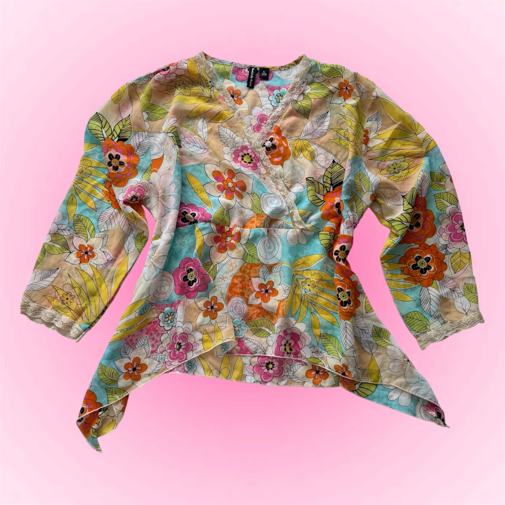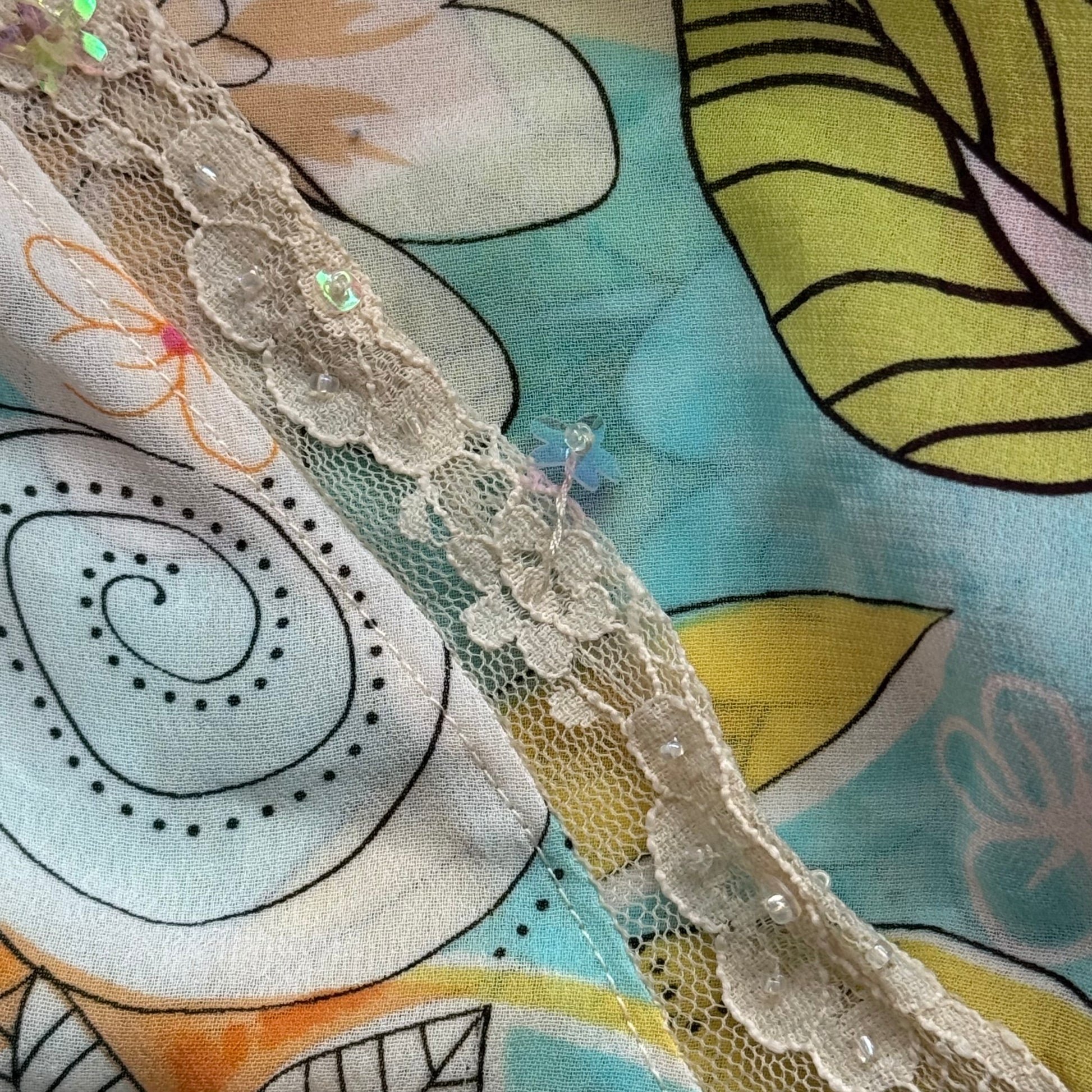 Super cute and colorful shirt. Features a flowy fit and a V-neck with sequins. Size L-XL