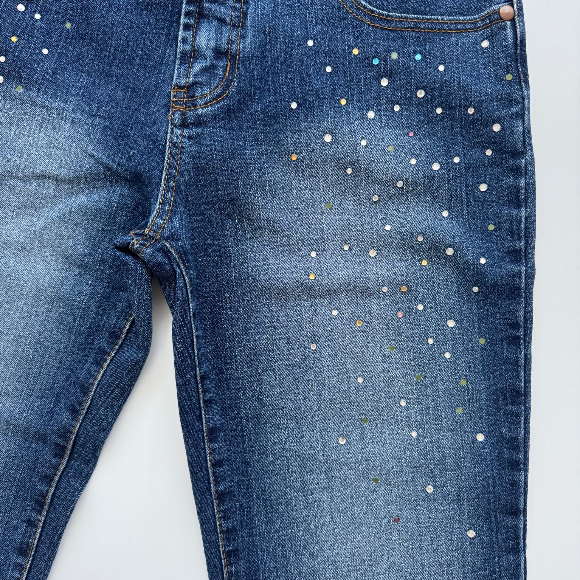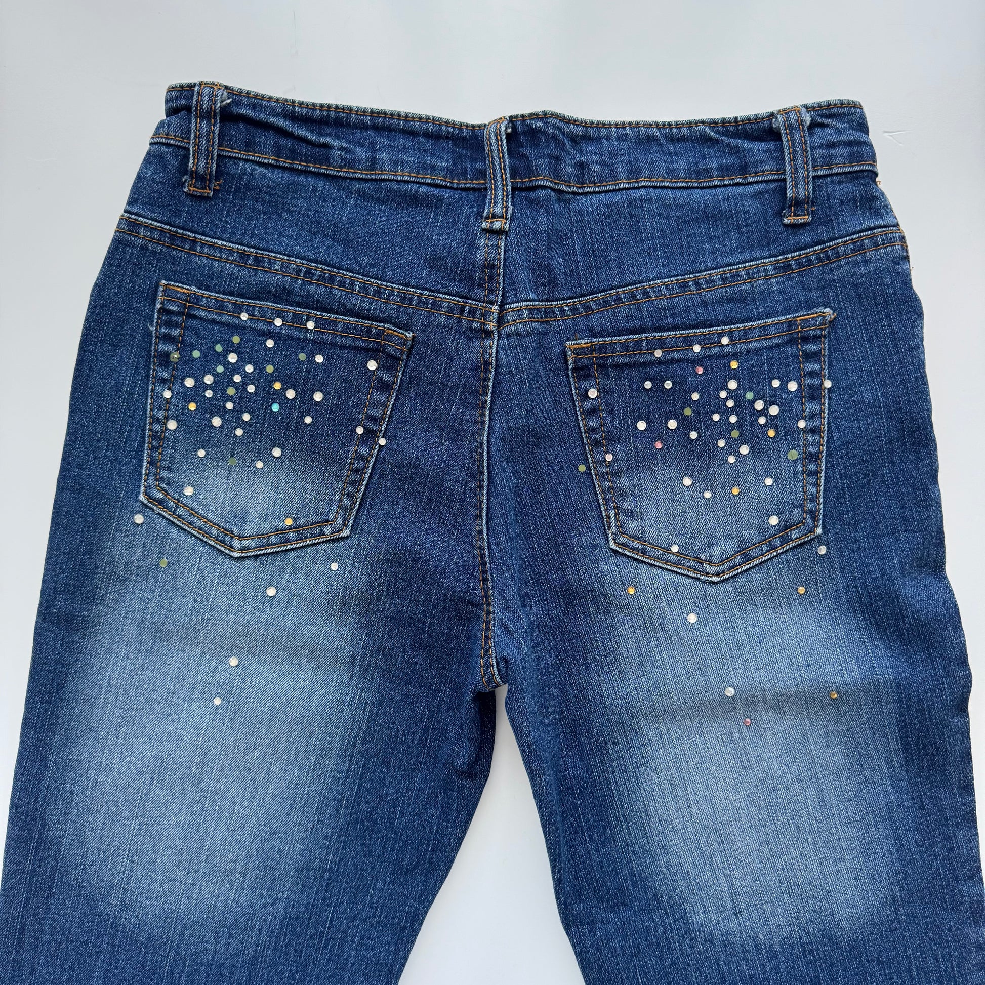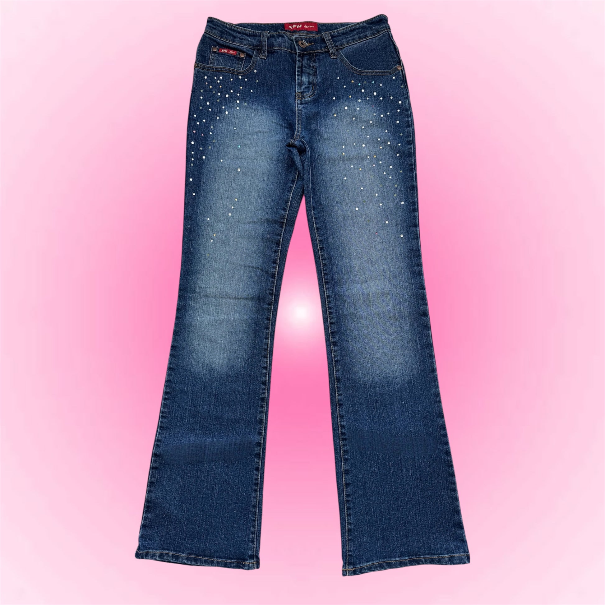 Cool mid waist flared jeans with rhinestones in the front and back (some of them are missing). Size M (fits more like S!). Brand: XFN Jeans